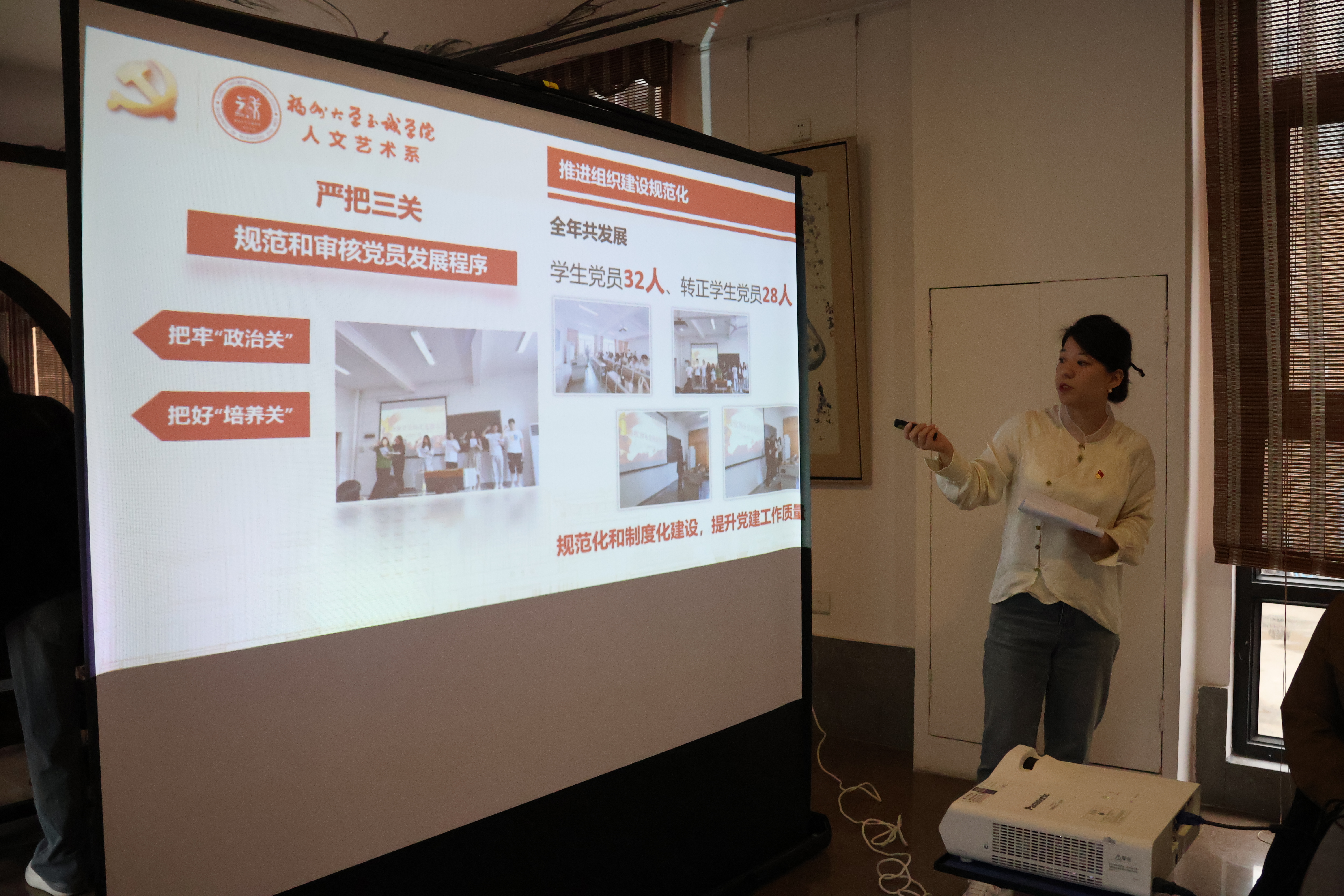 接着,至诚学院人文艺术系党支部林筠颖书记作分享。林筠颖书记介绍了人文艺术系的党建工作、活动开展情况和“五育并举”育人实践.