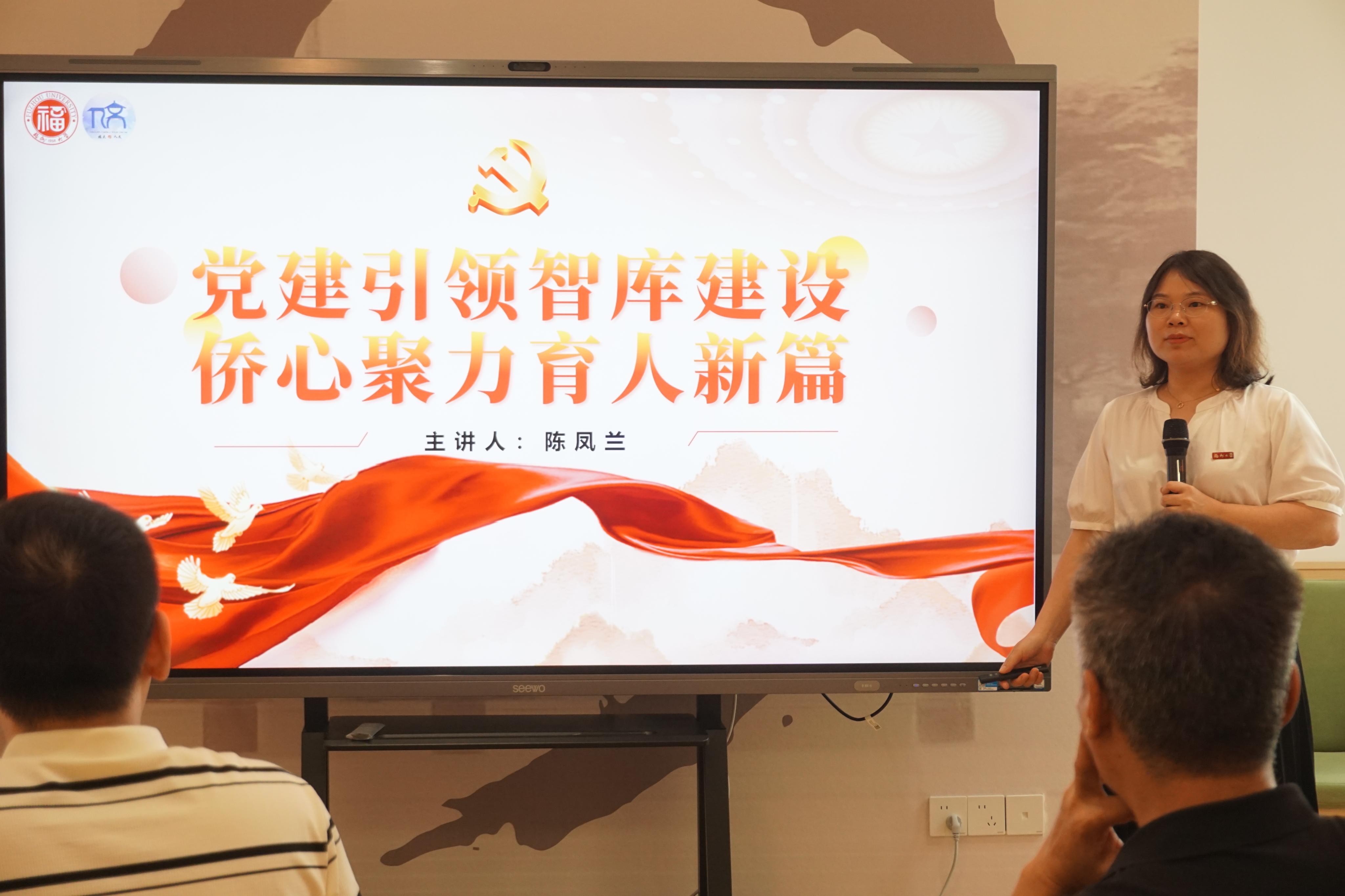 陈凤兰老师以《党建引领智库建设,侨心聚力育人新篇》为题,分享了党支部在推动党建与业务深度融合方面的创新实践与成效,重点阐述了党支部在智库建设、立德树人实践等方面发挥的党建引领作用。党支部在实践中探索出“党建+侨智”的发展路径,为服务国家发展战略提供智库力量。同时传承习近平总书记推动校地共建的理念,引领社会学系、侨乡研究中心与地方侨联共建失依儿童基地,构建“科研育人+实践育人+文化育人”三位一体模式,成为校地协同育人典范。