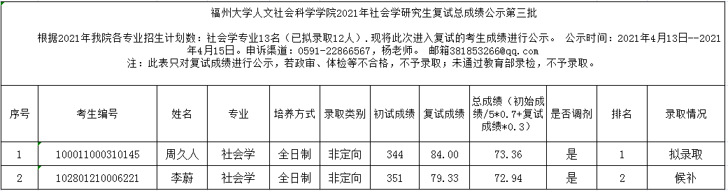 根据2021年色情游戏 各专业招生计划数:社会学专业13名(已拟录取12人).现将此次进入复试的考生成绩进行公示。
