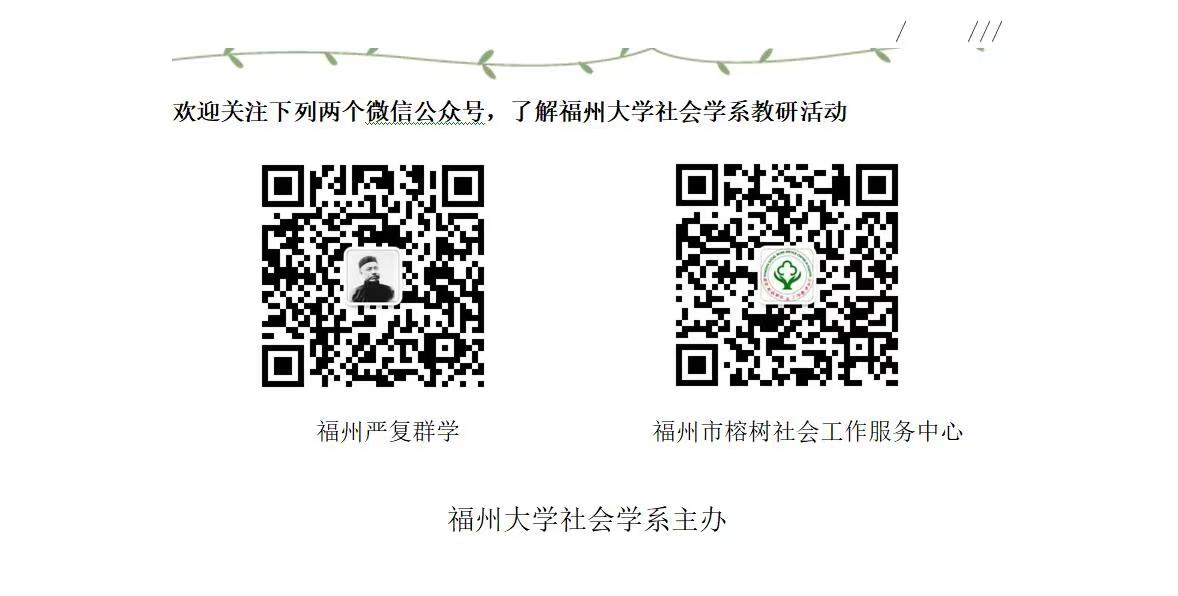 青年志愿者协会”,我系教师担任社团指导教师,前者为甘满堂博士,后者为王圣莉博士。学生在学期间,还可以通过参加本系教师课题研究,得到系统的社会调查研究方面的专门训练,全面提升社会学专业同学的调查能力、写作能力与社会沟通能力。我系甘满堂教授领办的福州市榕树社会工作服务中心于2013年3月福州市民政局注册,为社会学与社会工作专业实践提供了很好的平台支撑。