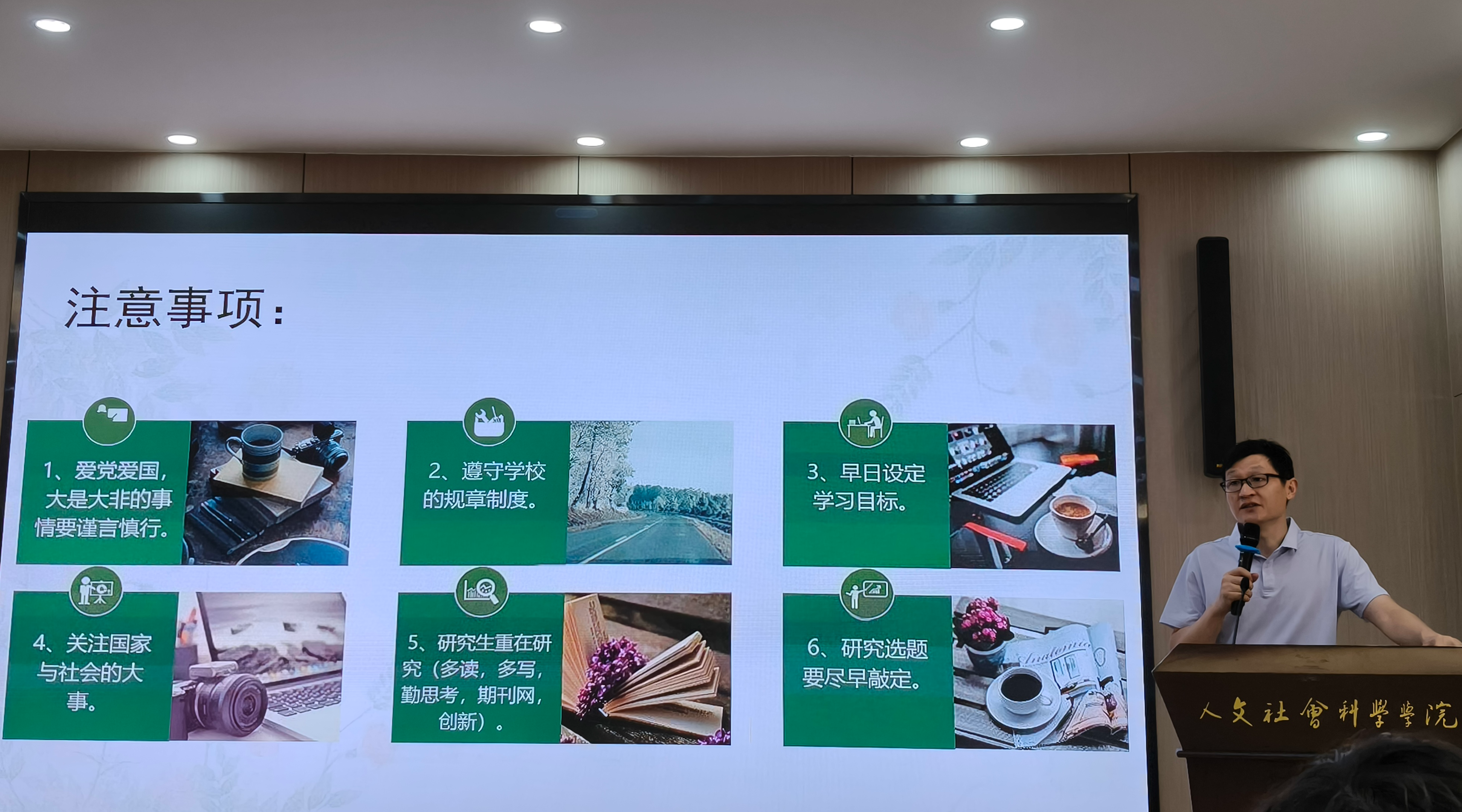 围绕研究生阶段的核心注意事项,林胜老师提出六点关键建议:一是坚守爱国爱党立场,在大是大非问题上保持清醒、谨言慎行;二是严格遵守学校规章制度,筑牢行为底线;三是尽早设定清晰学习目标,避免盲目度日;四是主动关注国家与社会大事,将学术研究与时代需求相结合;五是牢记研究生“重在研究”的核心,通过“多读文献、多写成果、勤思考”提升学术能力,善用期刊网积累资源,勇于探索创新;六是尽早敲定研究选题,为后续学术工作奠定基础。