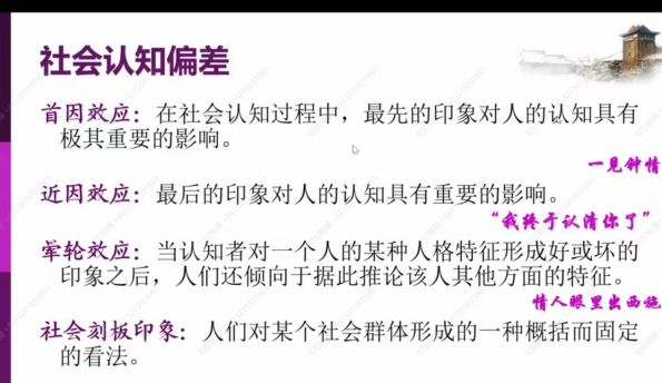 接着,讲座进一步解析“社会认知偏差”现象,聚焦首因效应、近因效应、晕轮效应及刻板印象四大类型,帮助学生辨识人际判断中的潜在误区,增强自我与他人的认知清醒度,提升社交适应力。