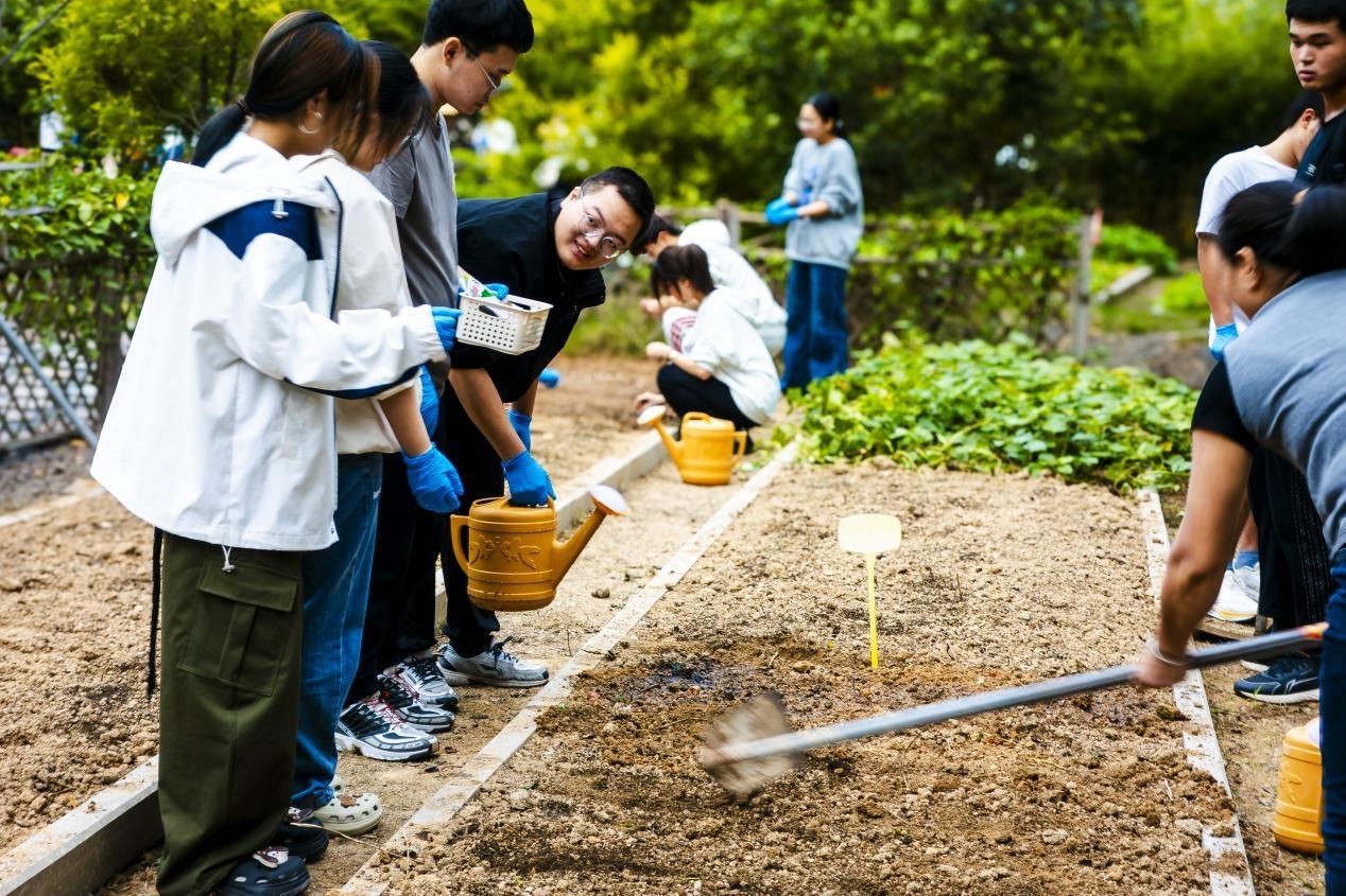 启动仪式后,种植实践环节正式拉开帷幕。同学们在工作人员的专业指导下,有序领取劳作工具,深入田间开展实践:从松土翻地时的力度把控,到播种育苗时的间距考量,再到浇水施肥时的科学配比,工作人员通过“理论讲解+现场示范”的方式,将农耕知识与实践技巧倾囊相授。田垄间,同学们分工明确、配合默契,弯腰播种的身影与泥土的芬芳交织,青春的活力在劳作中尽情释放。每一铲培土,不仅将希望的种子埋入土壤,更将“尊重劳动、热爱劳动”的理念根植于心;每一滴汗水,不仅浸润着土地,更见证着青年学子从“知识学习者”向“实践践行者”的转变。