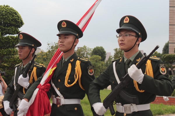 六点四十五分,升旗仪式正式开始。现场随着国旗护卫队的出现而安静下来,在全体师生的注目礼下,英姿挺拔的国旗护卫队以整齐划一的步伐护送国旗。伴随着雄浑的《义勇军进行曲》,鲜艳的五星红旗迎着初升的太阳缓缓上升。人文学子目光坚毅地唱着国歌,在国歌声中展现人文风采。仪式之后,校学生代表王俊杰同学以“让爱国成为一种信仰”为主题发表演讲:“为了实现中华民族伟大复兴的中国梦,我们当代大学生要有创新精神,要有世界眼光和博大胸怀。”王俊杰同学的演讲获得在场师生的热烈掌声。“五星红旗迎风飘扬,胜利歌声多么嘹亮”——为抒发自己对祖国的热爱,全校师生齐唱《歌唱祖国》,向祖国母亲寄以最真挚的祝福。人文学子昂首挺胸、目光如炬,将浓浓爱国情再一次寄于嘹亮的歌声之中。