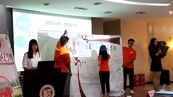 “防毒于微,杜毒于渐”禁毒实践队从活动内容、创新特色、典型事迹、宣传报道等方面汇报了其实践活动开展情况——在暑期实践中,禁毒实践队通过形式多样的禁毒宣传活动如循环展播福大学子原创历史禁毒话剧《清风徐来》,跨越两市六地进行禁毒知识普及,影响广泛。此外,“防毒于微,杜毒于渐”禁毒实践队创新宣讲形式,以实践队员饰吸毒人员向大家分享其内心想法,以吸毒人员自述的形式侧面反映吸毒的危害。