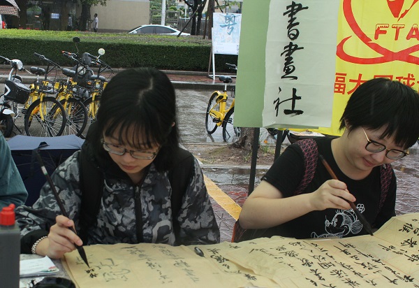 的国学社、幕礼社、丑石听潮书画学社、潮韵文学社等独具传统文化气息的社团——它们致力于传承中华传统文化,展现中华文化魅力。在纳新现场,各个社团通过海报、横幅、优秀作品展等形式向来往的大一新生们展示各社团的特色,其中,国学社以画扇再现文人墨客风雅,幕礼社以相声、戏曲服装展现曲艺风采,丑石听潮书画学社以现场书法表演展现汉字魅力——吸引了不少同学驻足并积极报名入社,其中不乏有部分留学生。社团宣传线上与线下同样重要,此次百团纳新,报名加入国学社的同学络绎不绝,国学社社长黄书婷对此表示,“以前国学社没有去扫楼,百团纳新时与别的社团相比有些冷清。今年去扫了楼,发现其实还是有一些人对国学感兴趣的,也有更多人加了新生群、关注了公众号。”