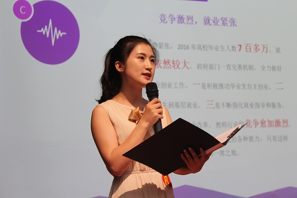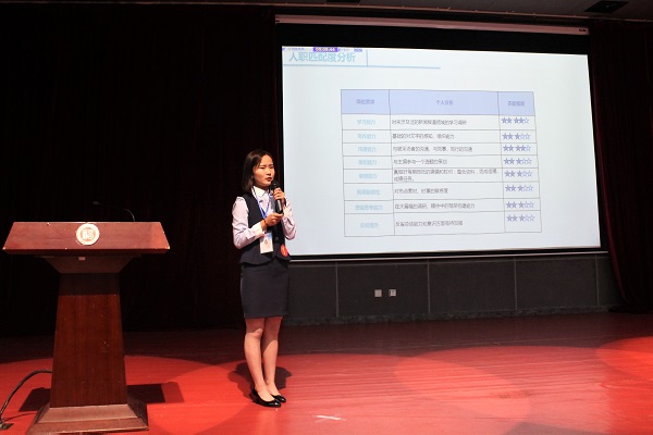 刘燕芬同学凭借自己主持人的经验在展示过程中展现了稳健的台风,并从自我探索、环境认知、职业内容、行动计划、评估调整5个方面具体介绍了自己的职业生涯规划。评委老师也根据两位选手的职业关键词提出相应的问题,并依据两位选手的回答给出了相应的建议,为选手以后的职业生涯规划提供宝贵的指导。在所有参赛选手展示完之后,信通集团人资行政总监郑曦老师上台致辞,为选手们提出了选择职业莫局限于自己的专业、大胆追求自己所想所求的建议,台下观众反应热烈。