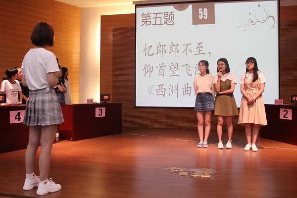 精彩绝伦、扣人心弦的海选与初赛后,12支队伍站在了此次人文知识竞赛复赛的赛场上。此次比赛分为下午场与晚上场,12支队伍分三组对决,选手们斗志昂扬、激烈拼搏,给观众们带来一场诗词的盛宴。本次比赛共六个环节,其中最引人注目的是“旁敲侧击”这一环节,小组在台上配合——“你描述我猜诗”。小组间默契的配合,精彩的表现赢得观众阵阵掌声。本次比赛更有亲友团助阵为选手加油打气,在亲友团的助力下六支队伍脱颖而出成功晋级决赛。值得一提的是,此次比赛设置了一支“特殊”的队伍:从被淘汰的六支队伍中选出四名优秀选手重新组成一支队伍晋级决赛,给了个人能力突出的选手再一次拼搏的机会。
