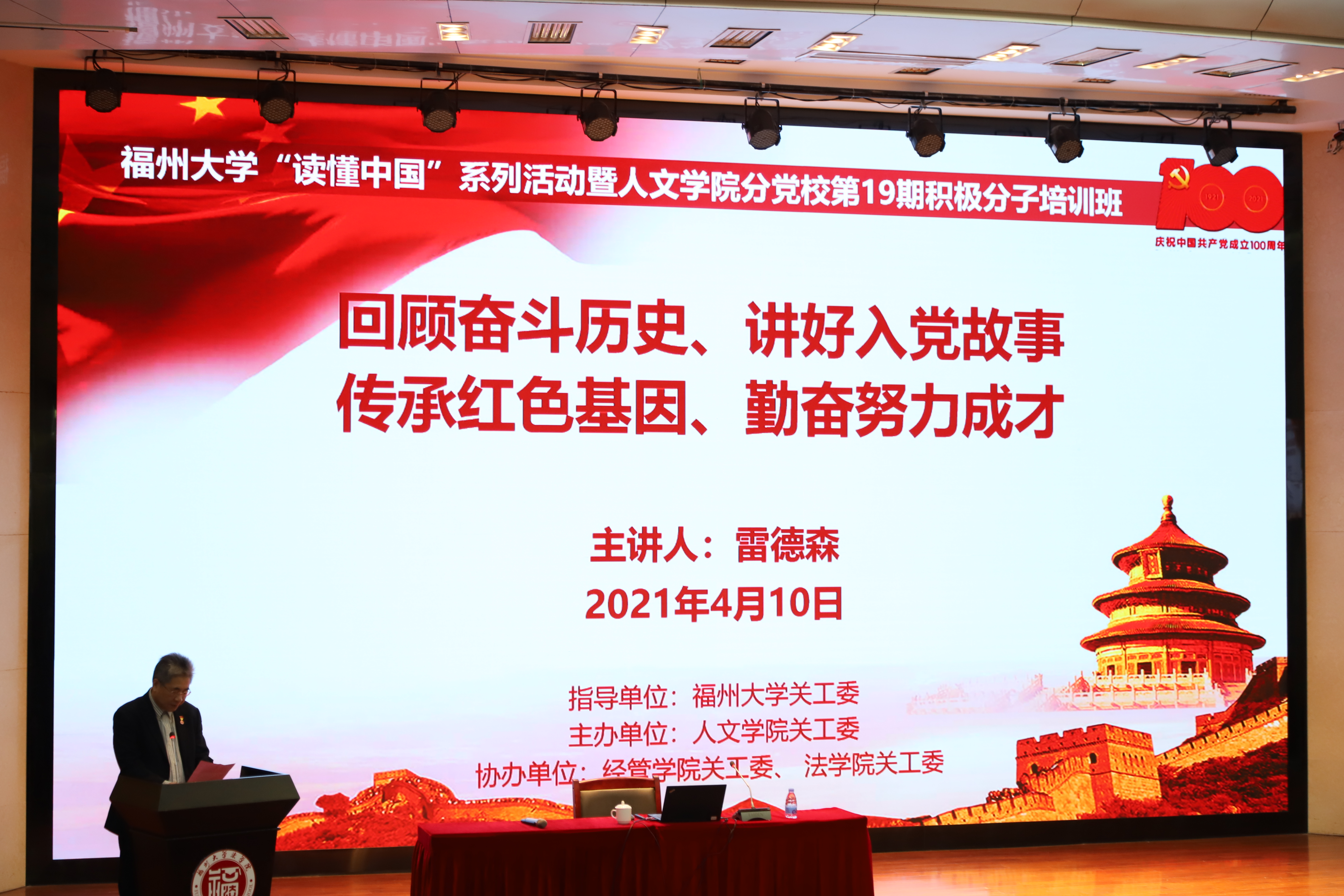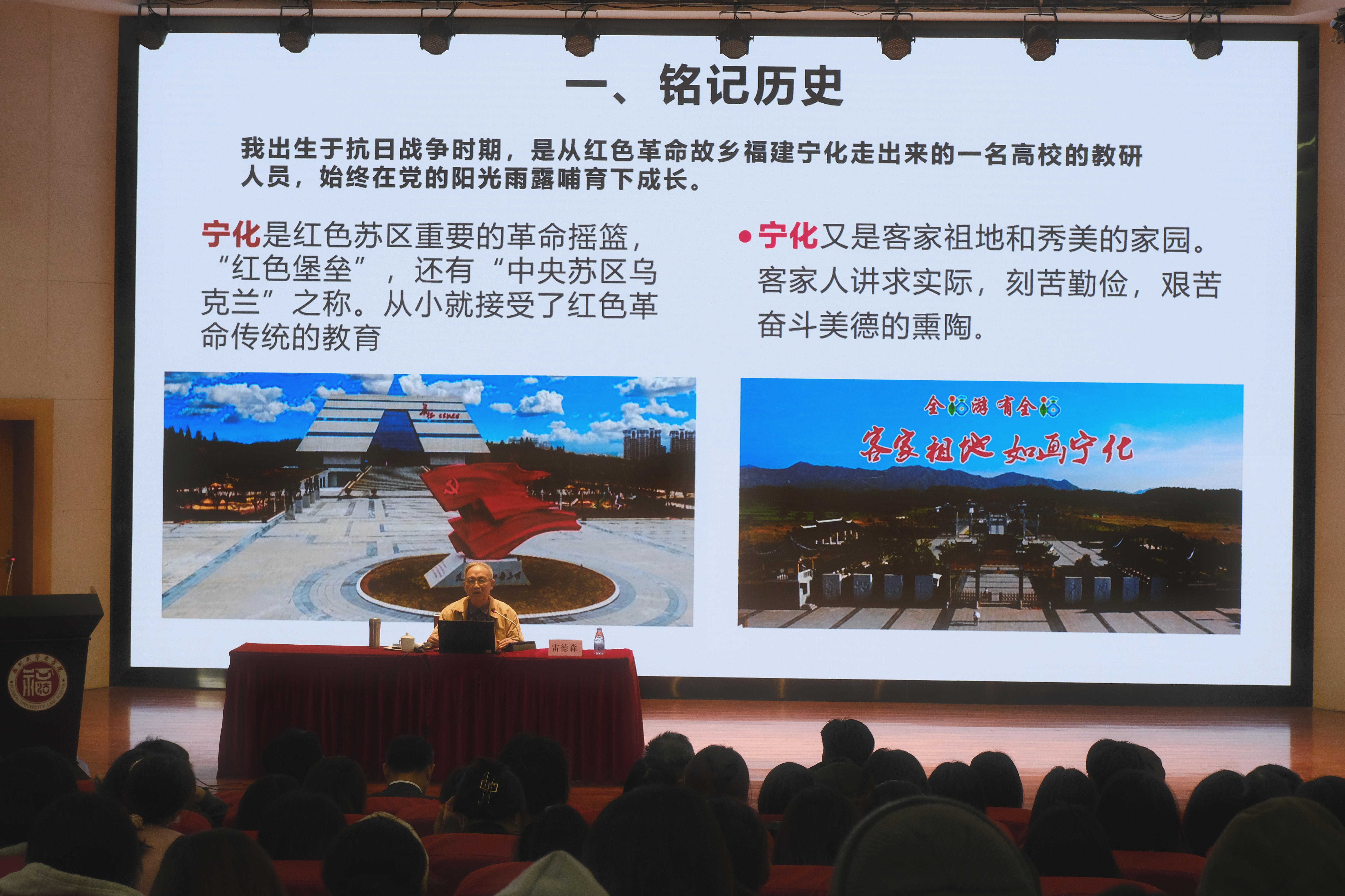 首先,雷德森老教授从“铭记历史”的方面回顾其在党的阳光雨露哺育的成长历程。在有“红色堡垒”之称的革命摇篮故乡宁化,浓厚的红色文化氛围使雷德森老教授自小便对党的事业产生极大向往,并坚定了为国为民服务的决心。他以自身在中国人民大学哲学系进修学习、“五七”干校学习等经历阐释读书对思想的升华和启迪,以自己参加苏区慰问团的接待工作和思想宣传队工作经验说明实际锻炼对人生方向的重要性,并表示这为其在之后运用专业知识更好的为党的教学与研究事业努力提供了前提条件。