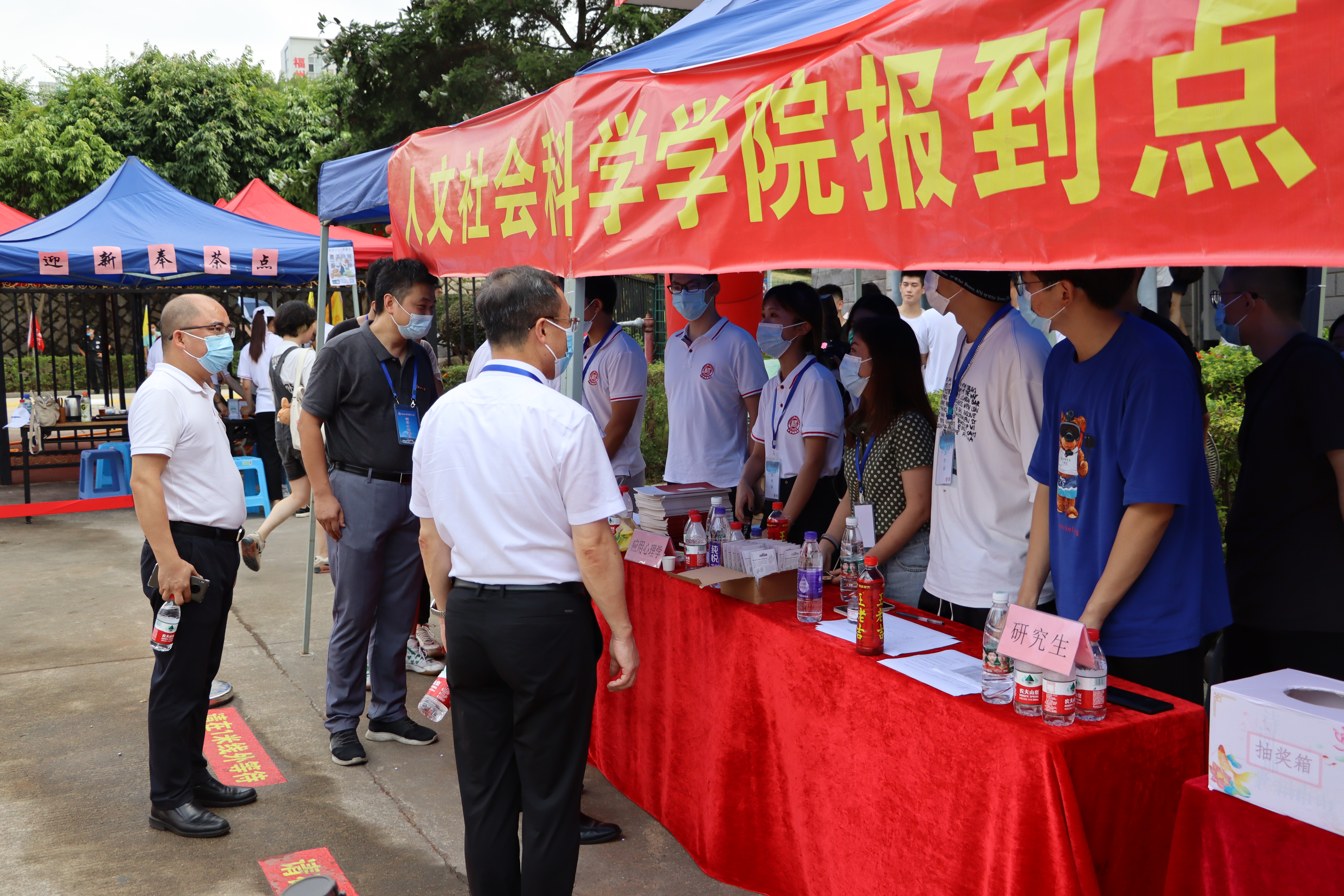 铜盘校区,汉语言文学、社会学及应用心理学的新生踏入校园,班导与志愿者们为到校的新生提供帮助和指导,志愿者们协助新生们搬运行李。研究生新生也在今天踏入校园,细心清点到校新生的资料、顺利完成签到流程。新生抽奖、入场券、签名墙……考研学子风采展示、色情游戏