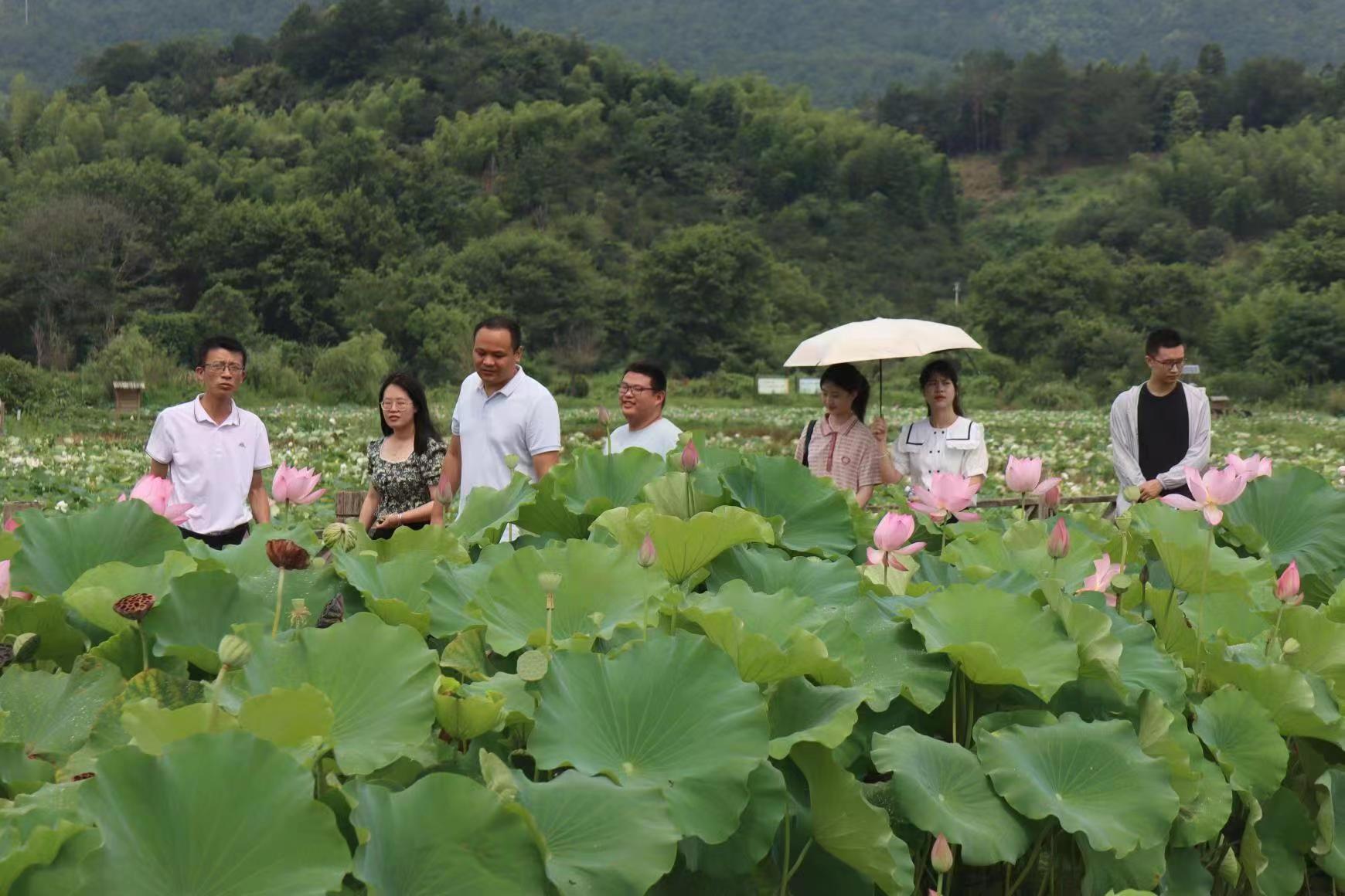 探访红色足迹之后,实践队师生来到了均口镇修竹荷苑考察学习。千亩荷花恣意绽放,在远处青山的衬映下,构成了一幅清新亮丽的美丽画卷。据修竹村第一书记刘鸿鑫的介绍,修竹荷苑景区是全省唯一以‘荷’为主题的国家级农业旅游示范点,修竹村还依托企业实施订单农业,提高莲农收入。同时,在均口镇镇党委副书记周文兴的讲解中,实践队师生进一步了解到,建宁大力发展莲田立体种养蟹、鱼、虾等,实现以莲为“媒”,促进了特色农业、乡村旅游与美丽乡村建设的融合发展。值得一提的是,2021届社会学校友余微通过选调任修竹村村主任助理一职,在挂村期间,余微充分发挥社会学专业特长,通过村情调研,认真梳理村内生态旅游发展的所需所求,探索“党建+乡村振兴”工作模式,助力乡村振兴,也帮助实践队成员更好地将专业知识与乡村振兴实际相结合。