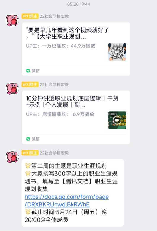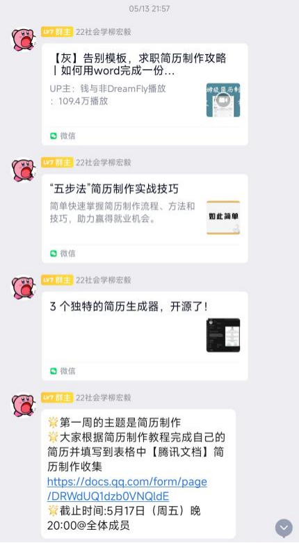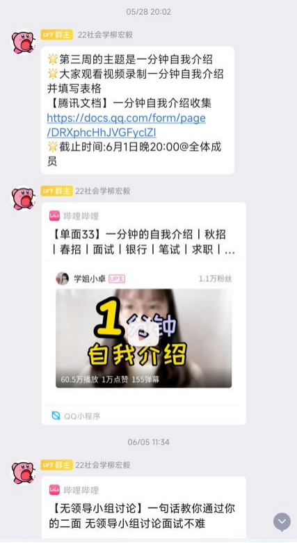 活动吸引许多同学参加。同学们每周通过交流群内发布的打卡链接上传学习内容,学习内容包含1分钟自我介绍、简历制作、生涯规划等。