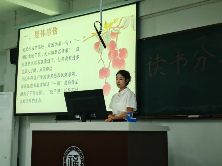 在徐鼎竑同学的带领下,同学们仿佛穿越时空,置身于那个繁华盛世,感受着荔枝从岭南到长安的漫漫旅程,以及它背后所承载的政治寓意和社会风情。钟皖宁同学从文学角度出发,分析了《长安的荔枝》中的叙事技巧和人物塑造,让同学们对这部小说有更深层次的认识。而杨春婷同学则聚焦于小说中的文化元素,探讨了唐代的饮食文化如何通过荔枝这一载体,展现出独特的地域特色和时代风貌。
