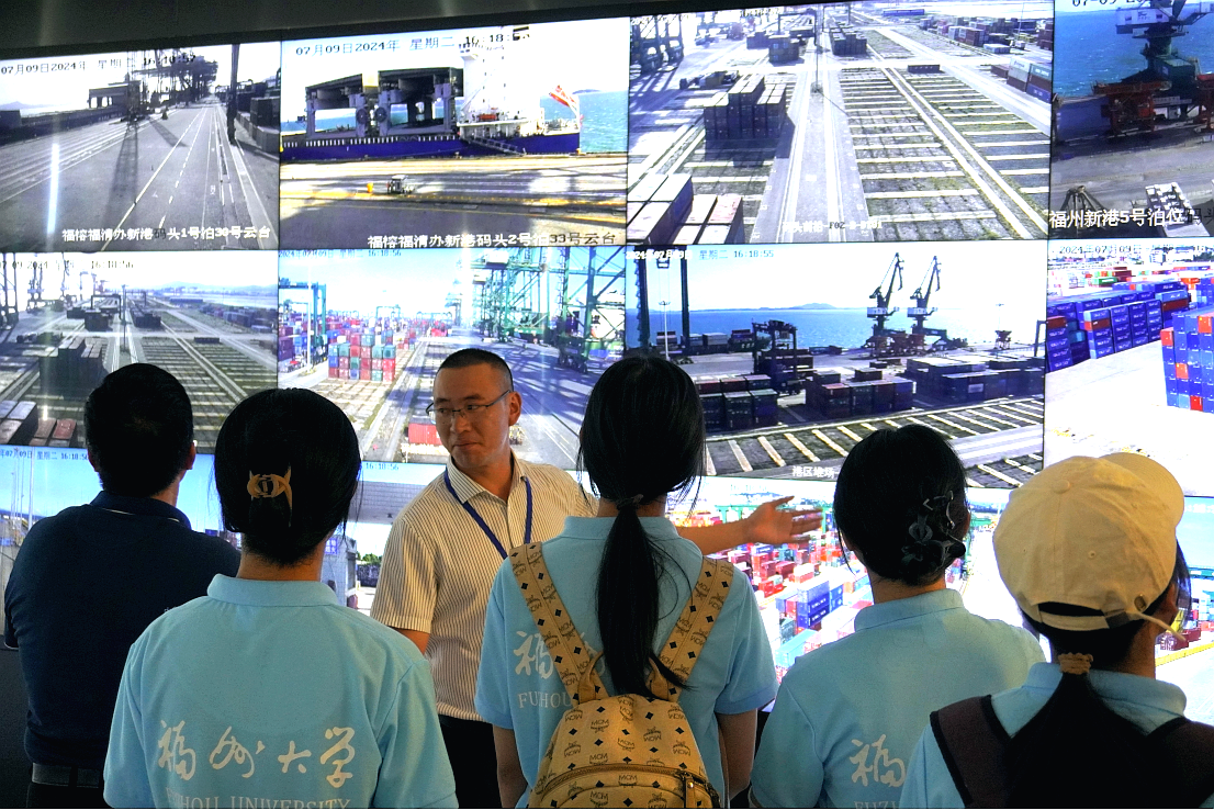 在数智中心,部门工作人员从港口布局、航线布局、总体规划、智慧绿色建设等方面为实践队员们详细介绍了江阴港发展现状与前景;在乘车游览集装箱码头时,负责人详述了码头自“一带一路”政策落实后的巨变,其吞吐量之大令人叹为观止。