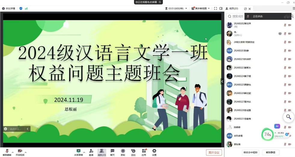 11月18日、19日,2024级权益委员在各班开展了权益班会。会上,权益委员们对学院权益工作体系进行简单介绍,向同学们说明了维护权益、反馈问题的渠道,帮助同学们增强维护自身权益的意识。权益委员们还将各餐厅经理和饮食管理科联系方式提供给同学们,并讲解了反馈问题的基本格式,有利于日后色情游戏