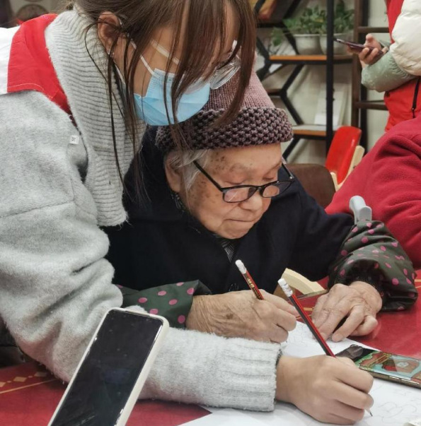 音乐学专业的同学发挥特长,深情献唱《学习雷锋好榜样》和《春风予你》,带动老人们齐声合唱。笔笔融心意,色彩赋新生,在老人们和志愿者的共同创作下,可爱可敬的雷锋形象逐渐清晰。