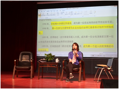 讲座伊始,洛秦老师作为吴蛮老师的好友,在整场讲座中担任了讲座的主持人,以一位至交好友的身份为同学们介绍了自己眼中优秀的吴蛮老师。在洛秦老师生动幽默的介绍下,我们了解到,吴蛮老师作为一名中国民乐演奏家,她把琵琶介绍到西方,功劳至大。并且作为第一个签约全球最大古典音乐艺人经纪公司ICM的中国民乐演奏家,吴蛮的琵琶艺术,已获得外国人的肯定。自从在美国成名至今,吴蛮老师已获得诸多荣誉和数个“第一”,但她最看重的,还是1998年获得哈佛大学女子学院颁发的研究学者奖,在这一年的研究期间,吴蛮老师的视野不局限于音乐本身,她更多地接触了科学、人类学、社会学、哲学等不同领域。在了解了吴蛮老师在音乐界数不胜数的成就与超高的人气之后,同学们对吴蛮老师产生了深深的敬佩之情,但吴蛮老师却谦虚的告诉我们,她现在所做的,便是致力于给琵琶一个新的定义,或者说人们对它的新印象,这就是为什么她在许多领域担任角色的原因。吴蛮老师说这是一项艰难的工作,但她却非常享受。这是音乐家应该做的,她愿意做这样一个抛砖引玉的人。