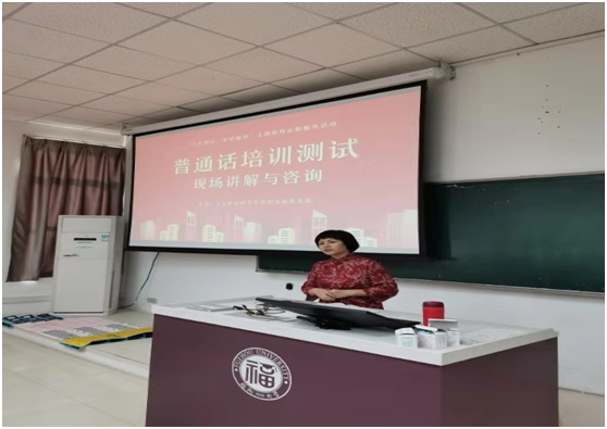 普通话培训测试站的基本情况,接着她细致讲解了普通话水平测试的等级划分、项目及评分标准、流程、注意事项等,并结合测试系统演示了实测程序,使学生们对普通话水平测试有了全面且清晰的了解和把握。在讲解中,梁老师特别指出了平时容易读错的字词,引导学生们重视语言文字规范化使用,同时她还给出了复习备考建议,增强了学生们通过普通话水平测试的信心。随后,学生们就普通话培训测试的相关问题进行了现场咨询,中文系党员教师认真回答了学生们的提问,同时也与学生们交流了普通话学习的方法和心得体会,使他们明确了说一口标准流利的普通话是当代人基本能力和核心竞争力的体现,加深了他们对于普通话重要性的理解和认识。