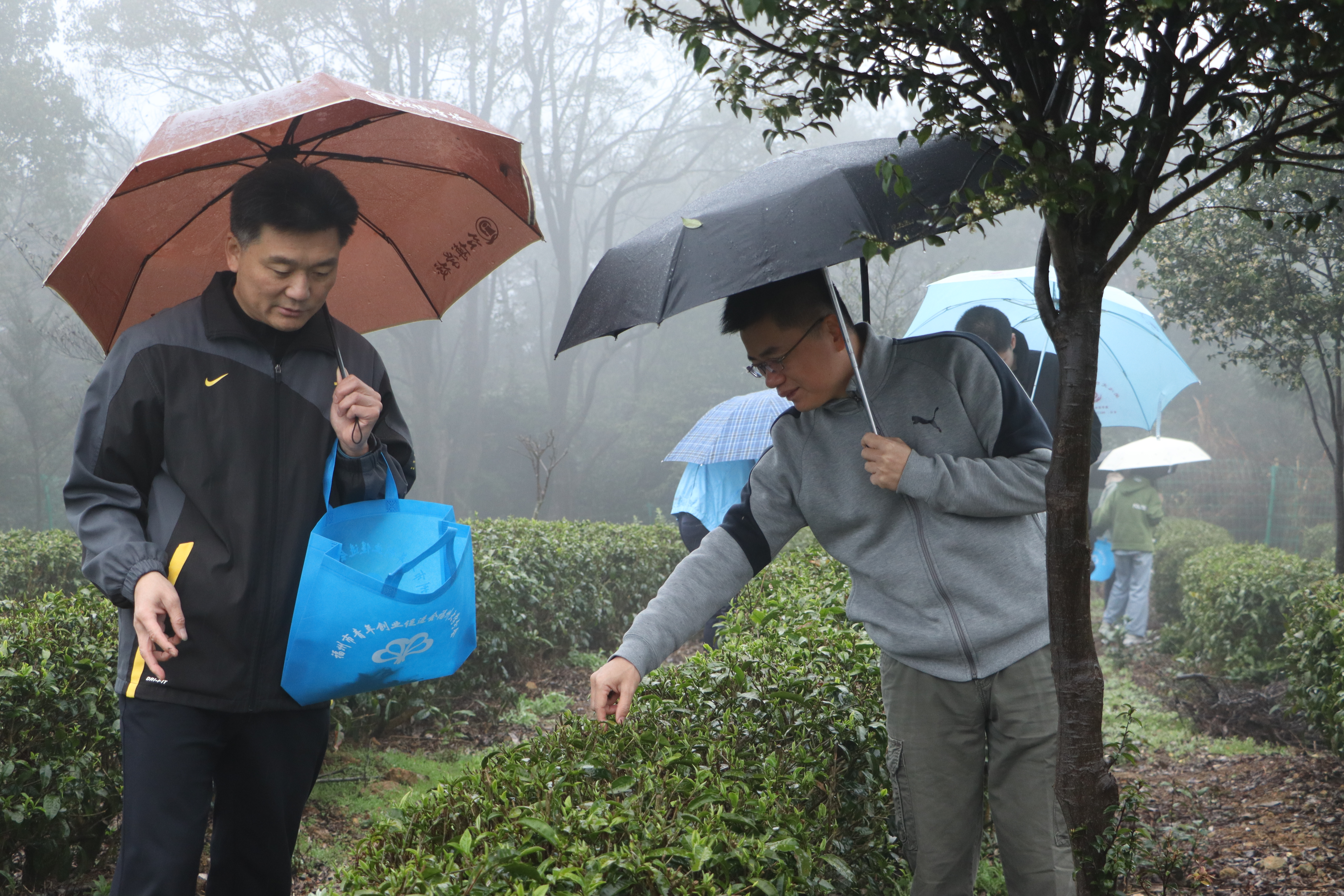 正式开始采茶前,王群书记首先为同学们讲解了采茶的技巧,传授了分辨茶叶的方法和选取采摘茶叶的标准。空中飘着的细细的雨丝也抵挡不了师生采茶的热情。大家两两一组,互相配合,在茂密的茶树丛中穿梭,一边观察,一边采摘,在实践中全方位感受茶的魅力。