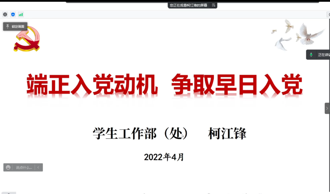 柯江锋老师分别从“入党动机是什么”、“正确入党动机内涵”、“如何端正入党动机”三个方面进行了详细介绍。他强调,唯一正确的入党动机内涵就是“中国共产党党员必须全心全意为人民服务,不惜牺牲个人的一切,为实现共产主义奋斗终身”。