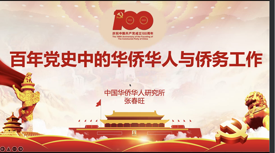 随后,张春旺所长以“百年党史中的华侨华人与侨务工作”为主题,从党史的角度来看待百年来华侨华人的发展,以共产党的成立为主线,从“华侨与马克思主义在中国的传播”、“新中国成立前以统一战线工作为导向的侨务工作与海外侨胞认同转向”、“以服务外交为导向的新中国侨务工作与侨务政策确立与海外华人的社会变化”、“以经济建设为中心和主导的改革开放时期侨务工作格局与华人华侨贡献”四个方面展开演讲。