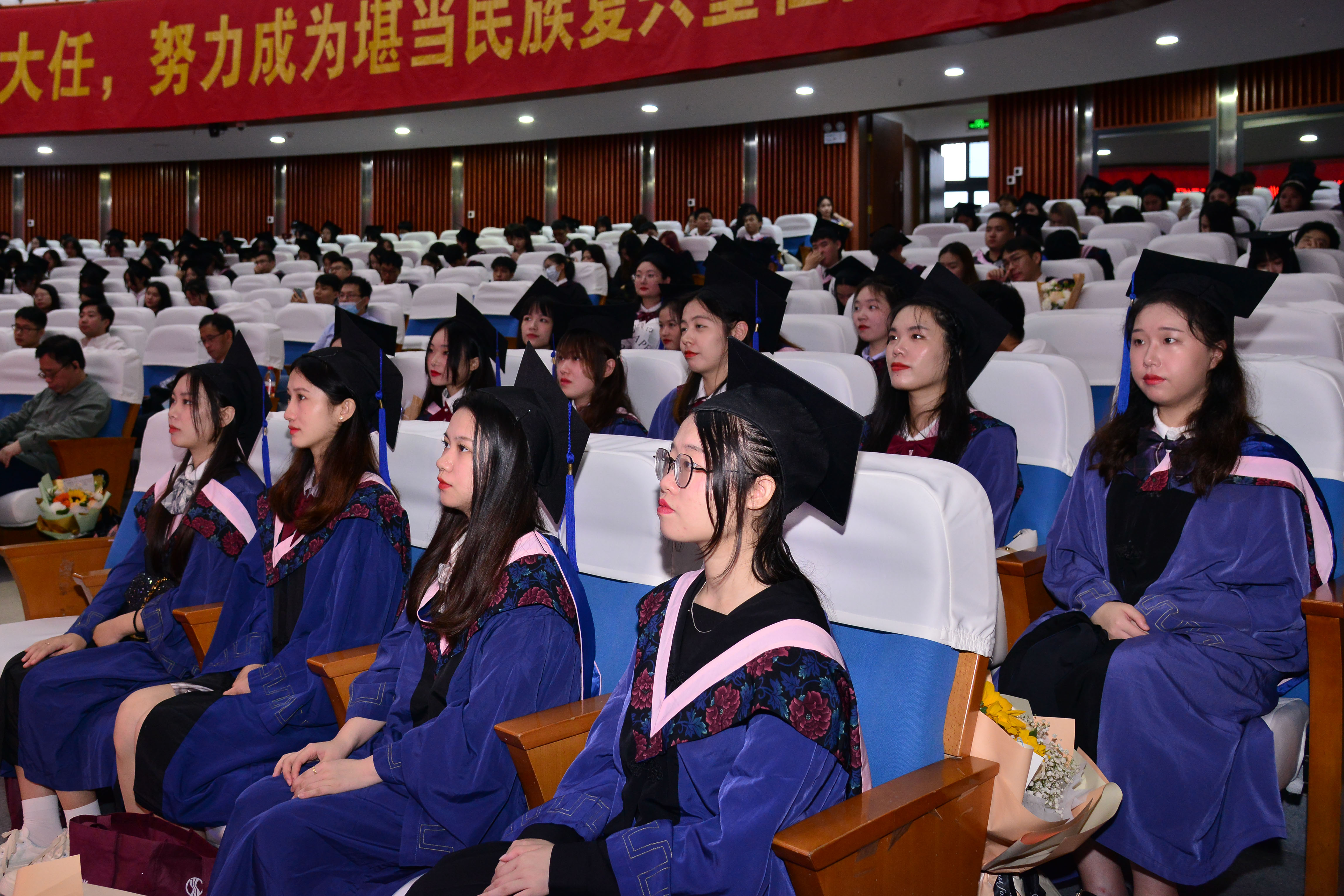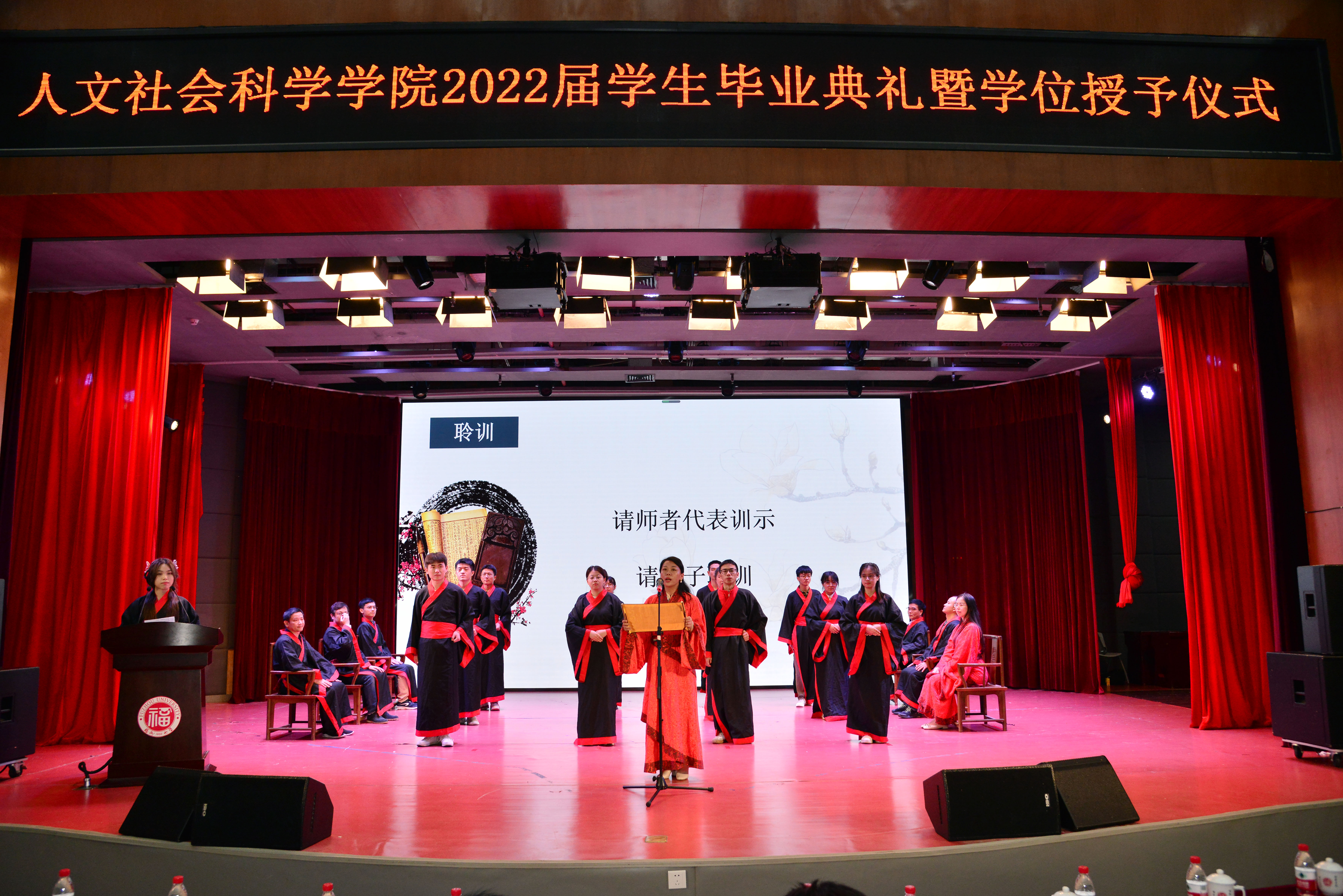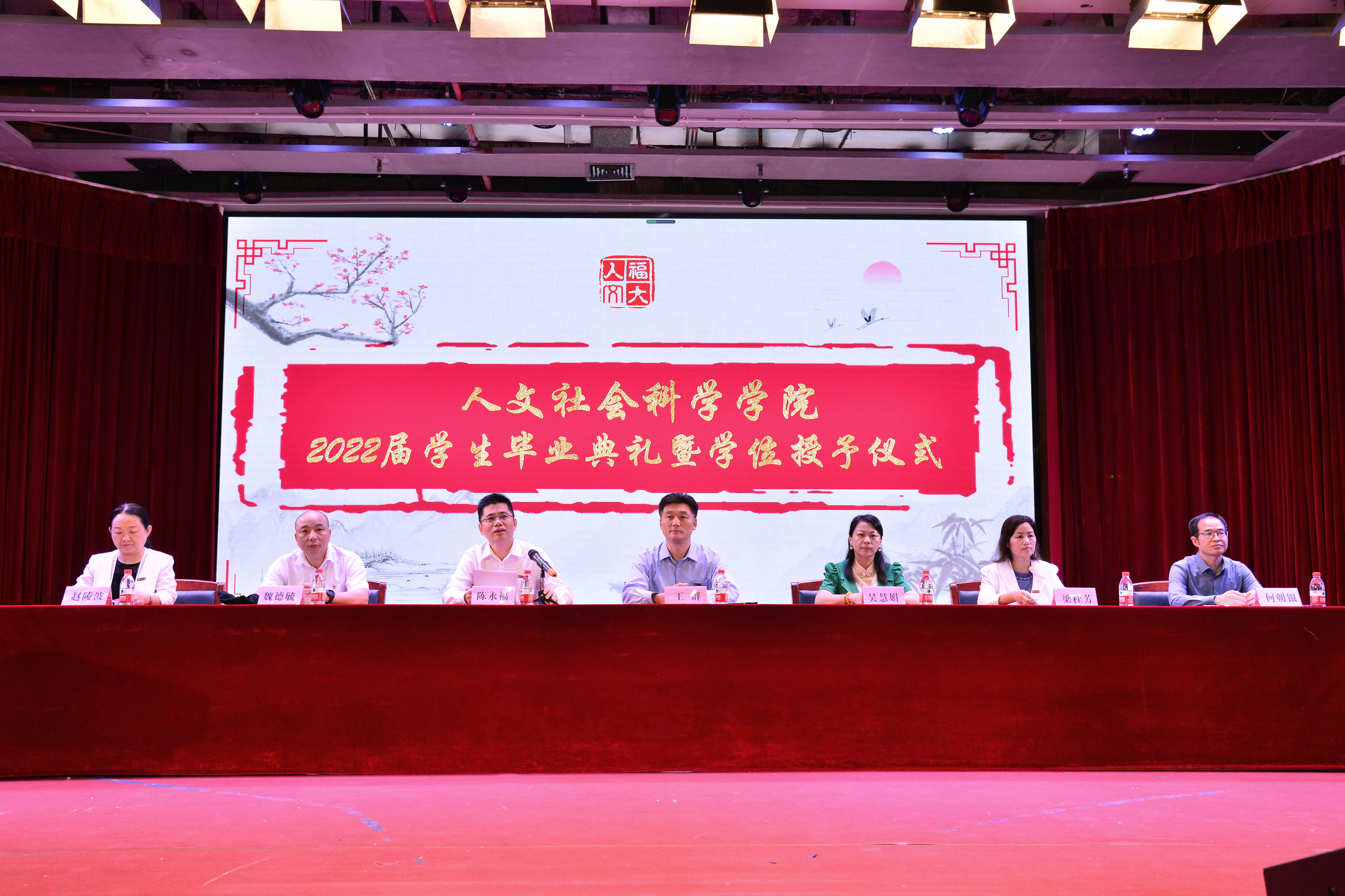 党委王群书记、院长吴慧娟教授、院党委副书记陈永福教授、副院长梁桂芳副教授、院工会主席魏德毓副教授、院长助理林胜教授、院长助理陈丽君教授、院长助理何朝银副教授、院纪委委员赵陵波教授等领导嘉宾出席毕业典礼,各系、各办公室教师、2022届全体毕业生、在校生代表和家长代表参加。典礼由院党委副书记陈永福教授主持。