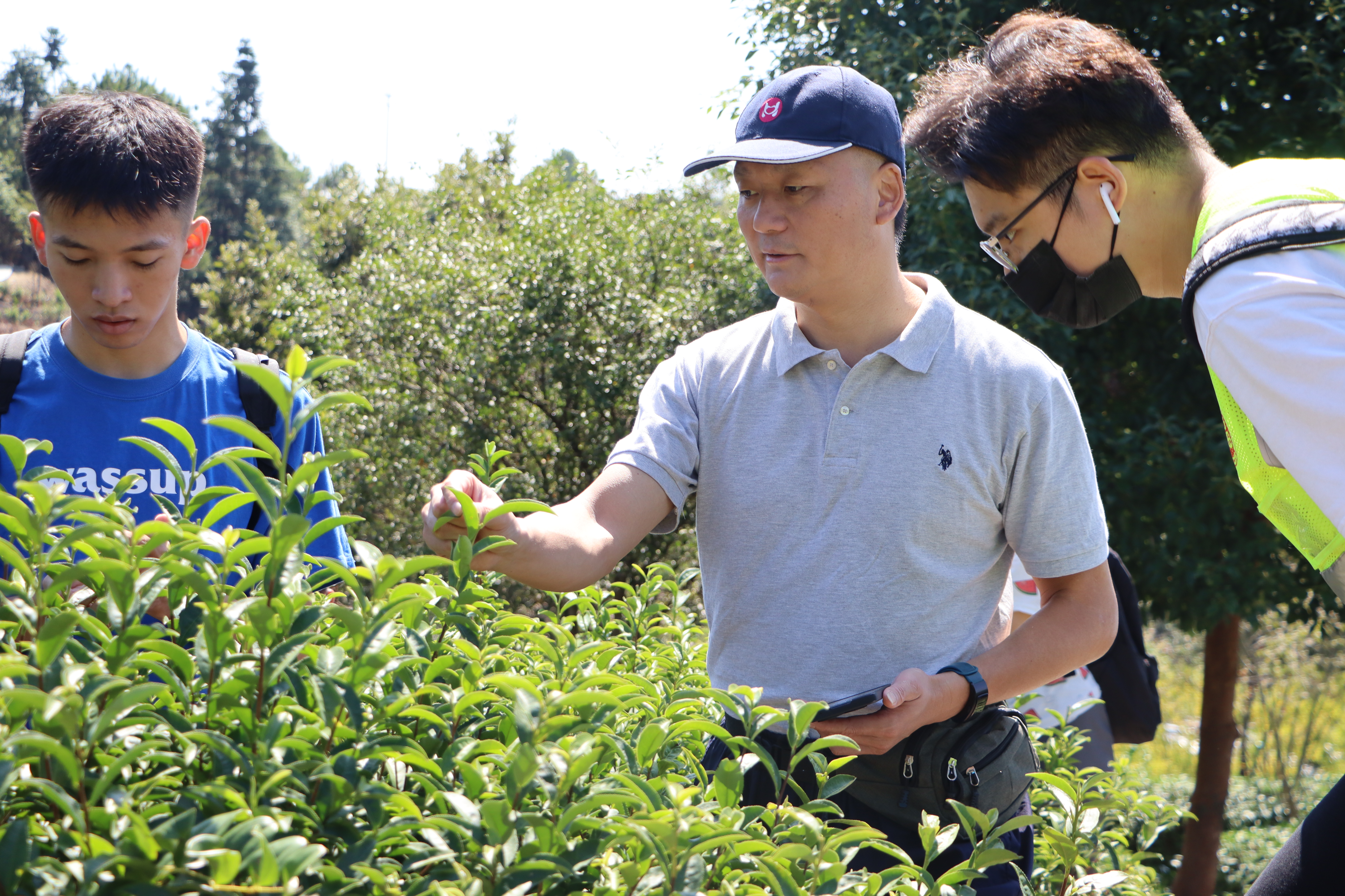 走进茶园,体悟劳动乐趣。烈日当空,一垄垄修剪齐整的茶树散发阵阵清香。正式开始前,王群书记为同学们示范采茶动作,讲解采茶技巧,亲切指导同学们进行采摘工作。了解基本的采摘方法后,同学们穿梭在茶树丛中,轻捻茶叶、观察色泽、细嗅茶香,在实践中全方位感受茶的魅力。