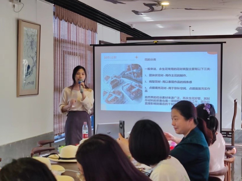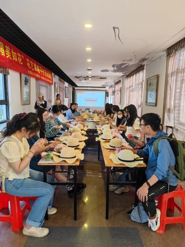 课堂伊始,专业花艺老师向大家讲授永生花、立体干花的制作过程,并就花艺草帽的布置形式和制作方法进行了介绍,随后大家设计各自的花艺草帽,并在老师的指导下将设计变为实践。