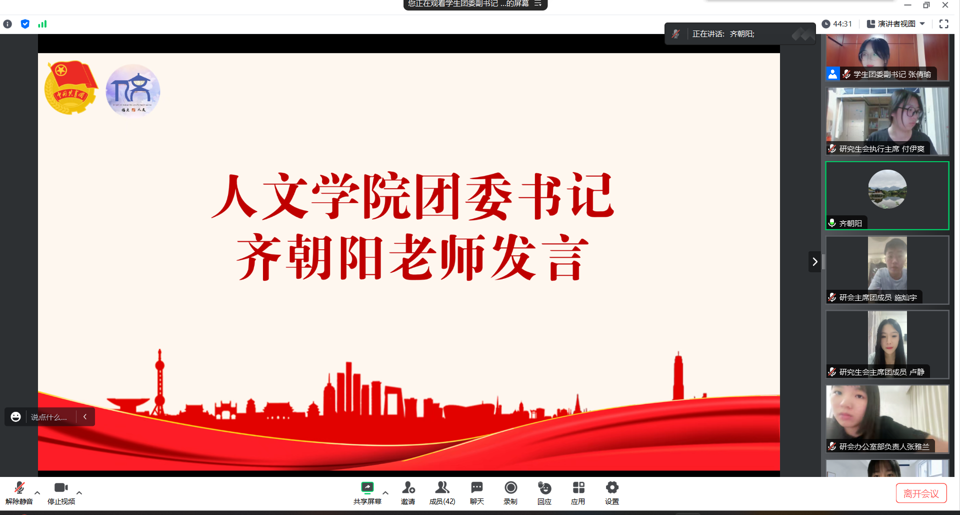 团委、学生会、研究生会主席团成员们进行自我介绍。团委各部门部长,学生会、研究生会各部门主要负责人分别进行了自我介绍和部门职能介绍。通过介绍,骨干们对彼此和各部门职能有了更全面的理解和认识。