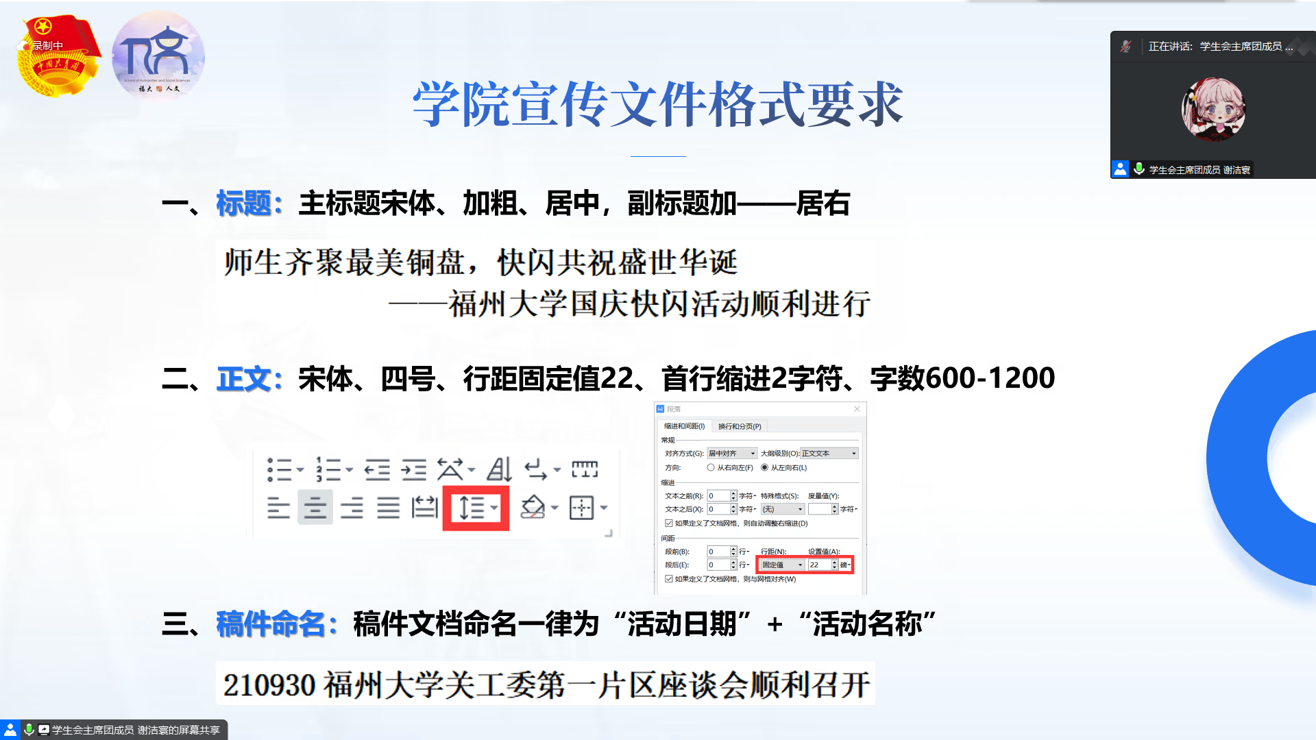办公室主任林思婷描述了物资借用、场地申请的流程与规范,权益部主要负责人周嘉欣介绍了综测加分规则与相关权益问题。