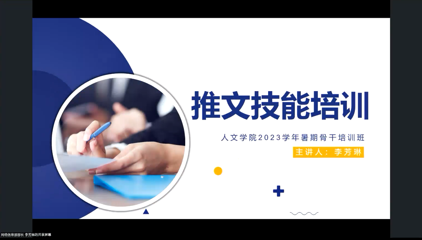 2023年暑期学生骨干培训班于8月9日晚正式结束。本次培训班面向团委、学生会成员,邀请2022届及2023届优秀的学生骨干进行通识培训,涉及新闻宣传、软件应用、活动策划、物资申请等多方面内容。
