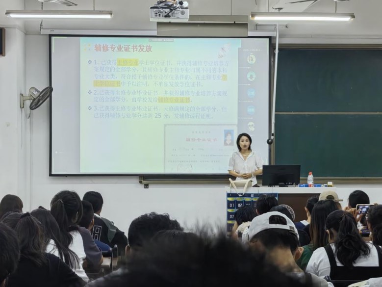 2023级新生“本科生教学教务工作”指导讲座以线上、线下两种方式在铜盘校区和旗山校区同时开展。副院长陈丽君教授为大一新生作《大学学习和学籍管理》报告,学院团委书记、2023级新生辅导员齐朝阳老师主持本次讲座。