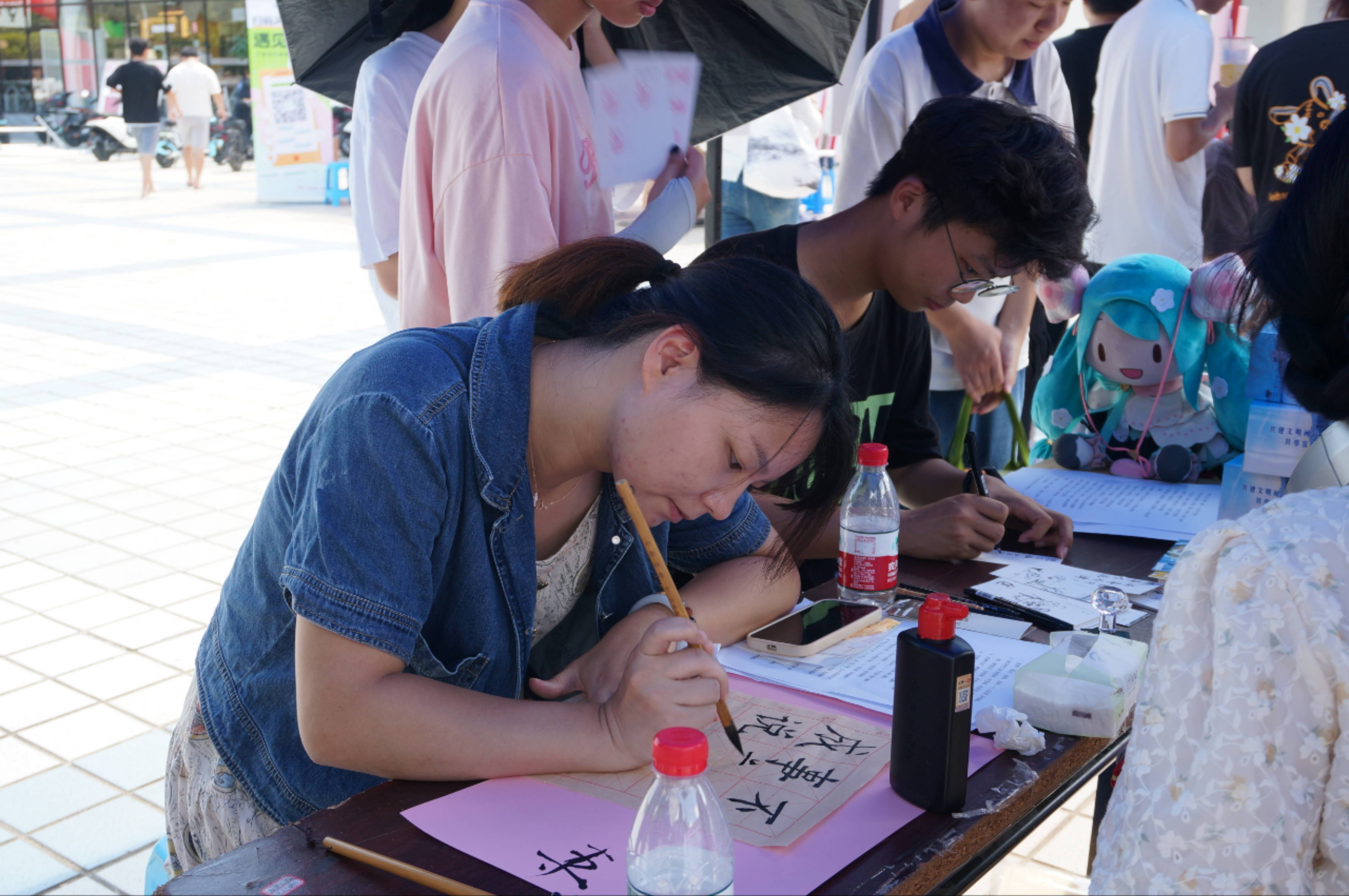 活动现场热闹非凡。“视·古韵乐投”小游戏以春秋战国时期的社交活动“投壶”为形式载体,参与者领取十只矢进行投壶,根据投中的箭矢的编号,在汉字题库中依据古文字形探究今言文字。该项游戏寓教于乐,文武兼修,工作人员还会在参与者游玩时细心讲解文字出处,耐心解释字源字形,增强参与者对国家通用文字的认识。在“听·闻声辨句”小游戏中,参与者认真聆听并识别普通话版本的《论语》原文,学习普通话的标准语音,增进普通话交流运用的能力。而“读·经典传诵”和“写·墨染千尘”两个小游戏则聚焦综合运用,参与者在诵读和摘抄《论语》经典名句中能够进一步提高对国家通用语言文字的使用能力,提升对中华优秀传统文化的热爱。