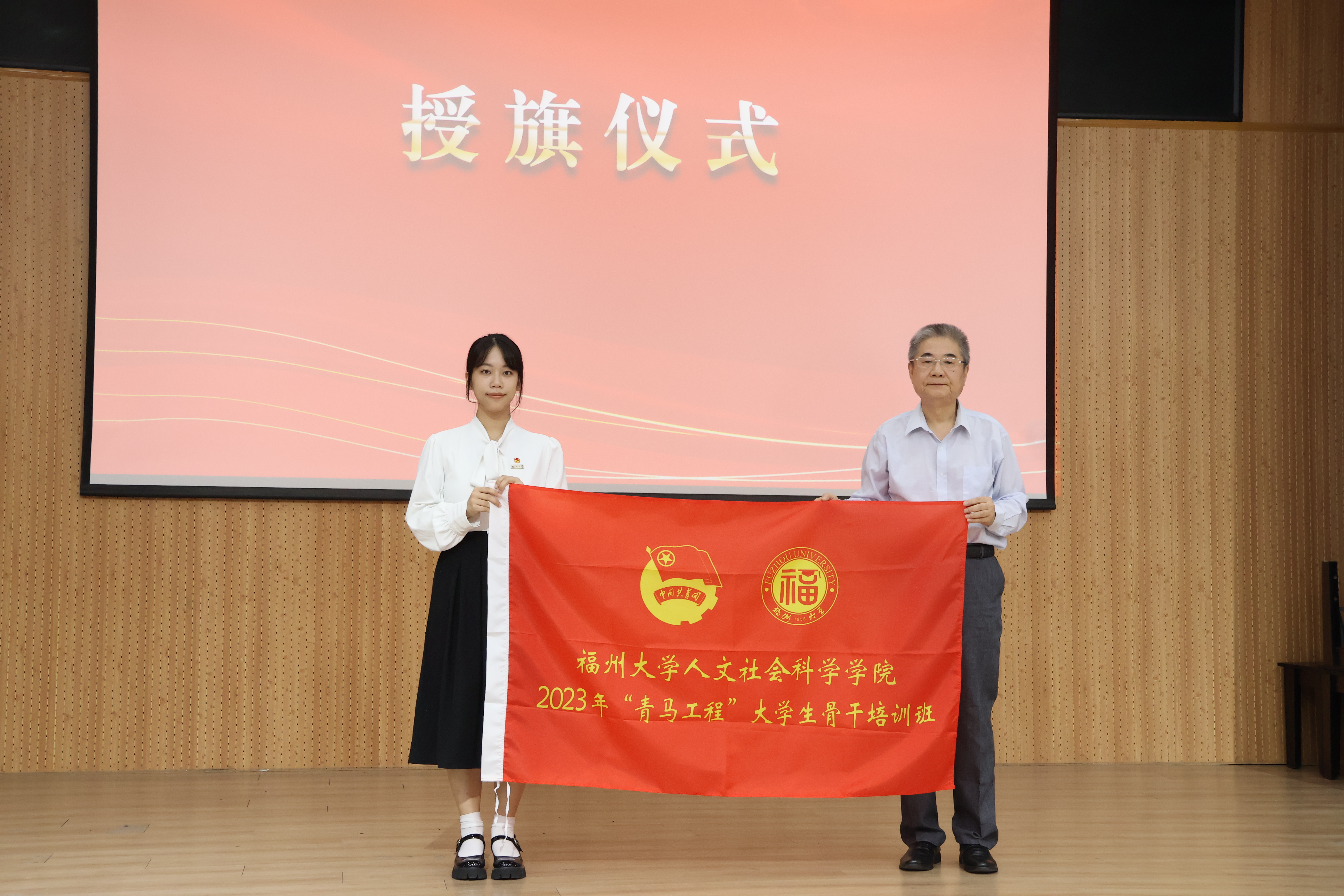 陈少平研究员向培训班学生代表授旗。相信在青马班旗帜引领下,新一批人文学员能一如既往地深学深思,砥砺前行,争做有理想、敢担当、能吃苦、肯奋斗的新时代好青年。
