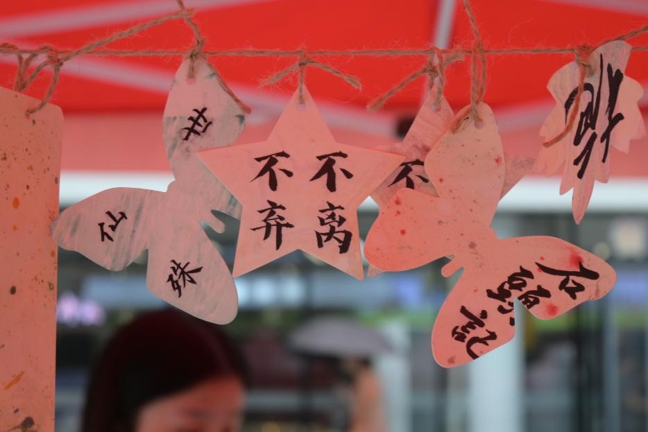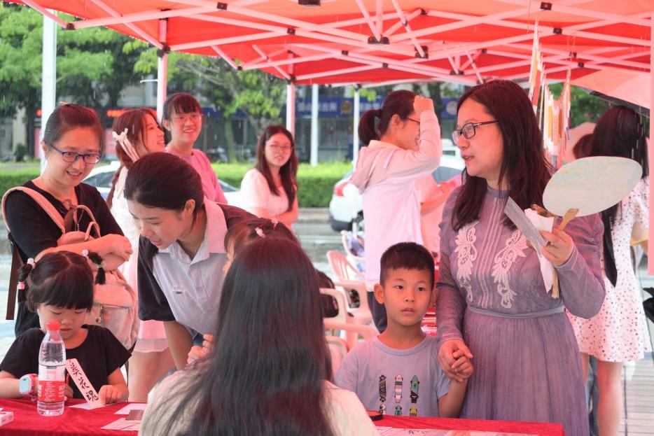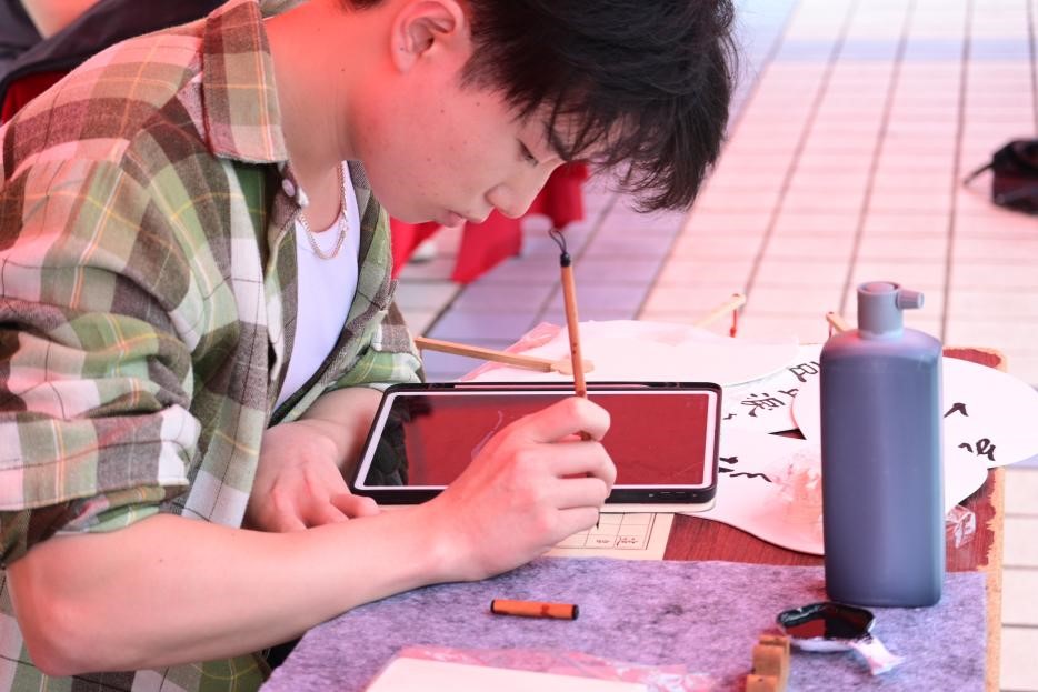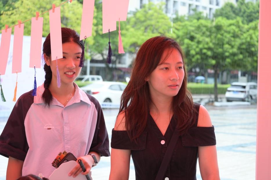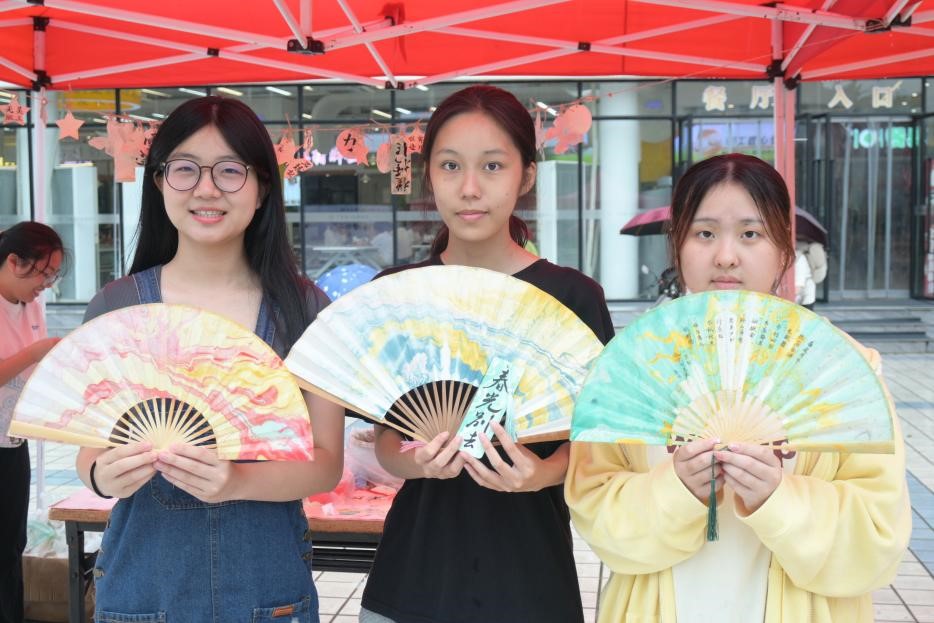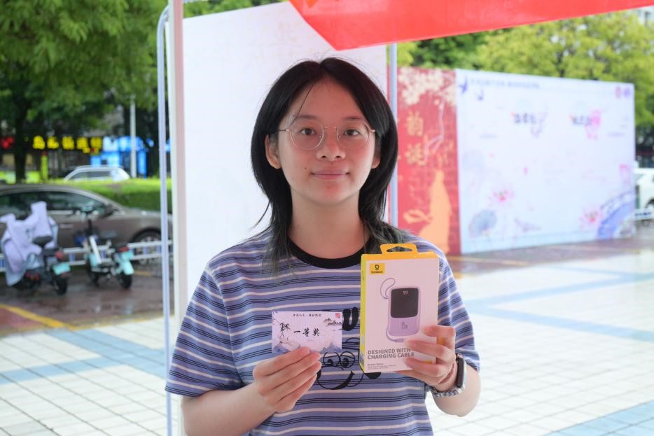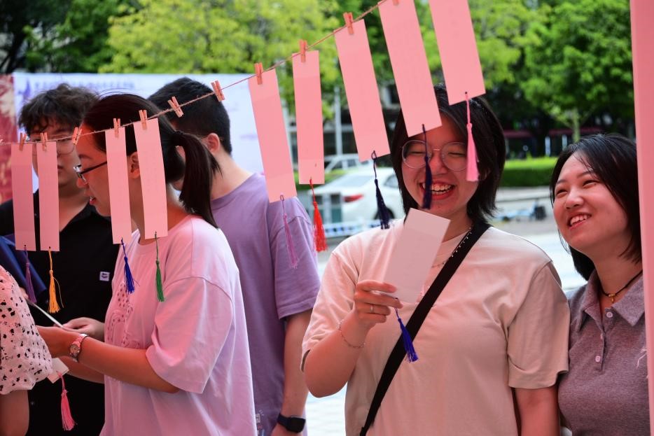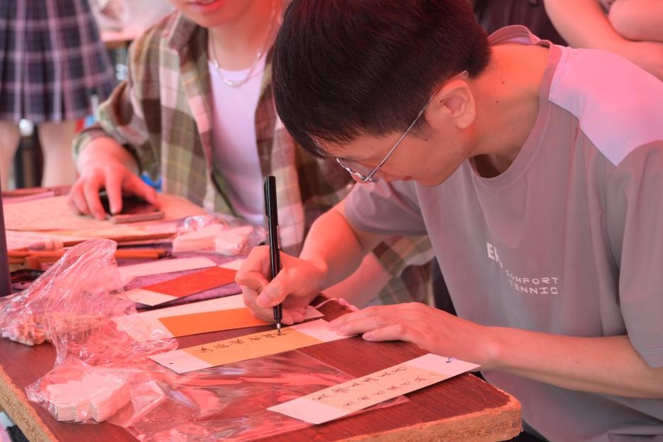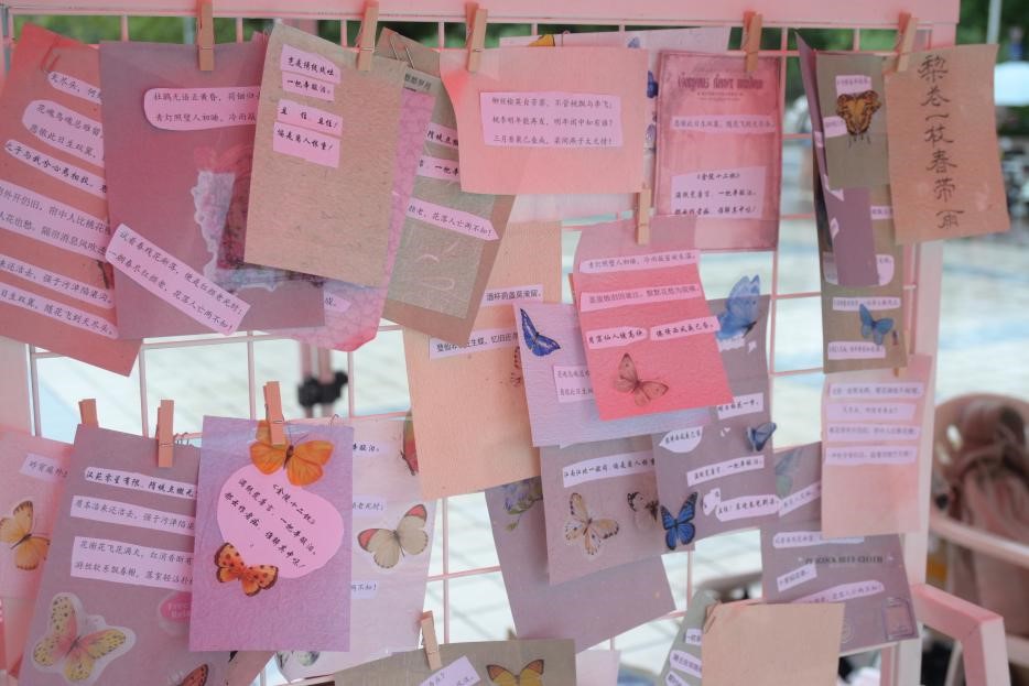 活动当日,虽遇雨天,但同学们热情依旧。“探·飞花红楼”自《红楼梦》中采撷用语,进行成语接龙飞花。同学们文采飞扬,妙语连珠,有来有往。在学习到成语读音、出处、含义的同时,也体悟到了文学经典的语言积淀与悠长文韵;“猜·红楼迷梦”以灯谜为引,带领同学们走进红楼世界,用心感受红楼元素间千丝万缕的关联,加深对《红楼梦》的理解体会;“贴·梦剪诗拼”精选《红楼梦》中人物所创诗句,为参与者提供充足创作材料。同学们通过选取诗篇、裁剪诗句、添加贴纸,创造独具个性的粘贴诗作品,抒写青春蓬勃诗情,实现对文学文本的再创作,赋予经典新的生命力,强化对语言文字的运用;“绘·漆梦红楼”将传统漆艺与红楼诗词名句相结合,参与者以彩漆绘梦,以文墨抒怀;“读·语忆红楼”并行普通话朗读挑战与配音大赛,同学们得以在朗读中贴近红楼文本,与书中人物共经悲欢离合,共感喜怒哀乐,也在朗读中感受到语言文字之美。