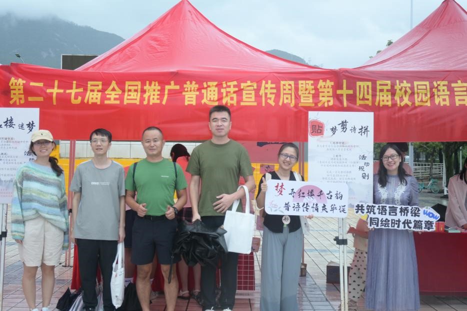 中文系教师来到现场,共同体验游园活动,并针对国家通用语言文字的应用方面为同学们答疑解惑,使同学们对国家通用语言文字的认识与理解更加深入,提升同学们说普通话、写规范字的意识和能力。活动现场,师生其乐融融,凝聚共同力量,为推广普通话事业贡献福大力量。