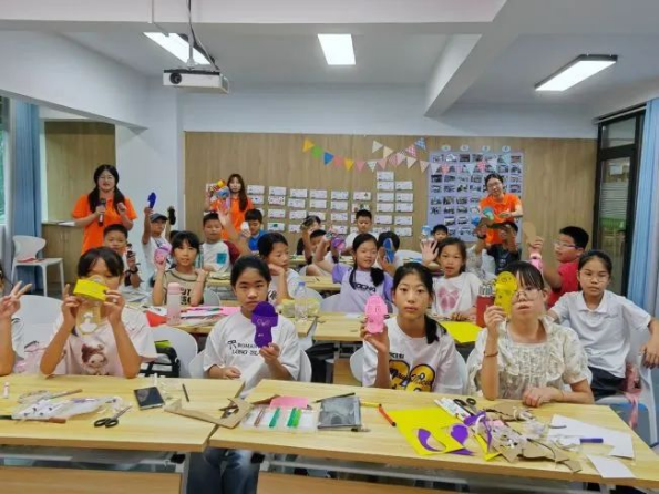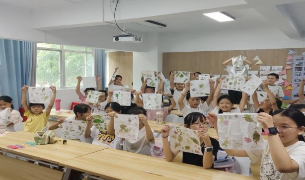 《奇妙的古汉字》课堂上,志愿者化身为“汉字导游”,带着孩子们开启一场穿越时空的汉字之旅,当看到“山”字像三座山峰,“水”字像流动的河流时,孩子们发出阵阵惊叹;《古法草木拓染》课上,叶脉纹路在小锤子轻敲的“咚咚”声里被慢慢印在了布上,举着独一无二的拓染手帕,孩子们笑称“这是夏天给我们盖的印章”。《诗句创意拼贴》中,“小诗人们”的悄悄话让孩子们平日里藏在心里的感受顺着笔尖跳进诗句里;《闽南泥土里的夏日时光机》上,孩子们用粘土捏成的古厝再现祖辈的生活。《追风的夏天》里,当孩子们自行在其上作画的风筝载着童心飞向云端,风里不仅有夏的燥热,更有童心撞进天空的清脆声响——“原来所谓“追风”,不过是让快乐乘着风,飞向孩子们眼里的远方”一实践队成员感慨。