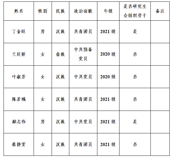 为选举生工学院参加福州大学第十六次学生代表大会代表,本院于2022年6月22日至2022年6月24日召开会议,在代表候选人所在班级团支部对其进行表决,郝志伟、蔡静雯等8名候选人经班级团支部表决通过;于2022年6月24日召开学院学生代表会议,采取差额选举的方式,对代表候选人进行表决。现对6位正式代表进行公示,公示期为2022年6月24日-2022年6月26日,意见反馈于研究生会周惠媛,联系电话:13178030882,邮箱:[email protected]。