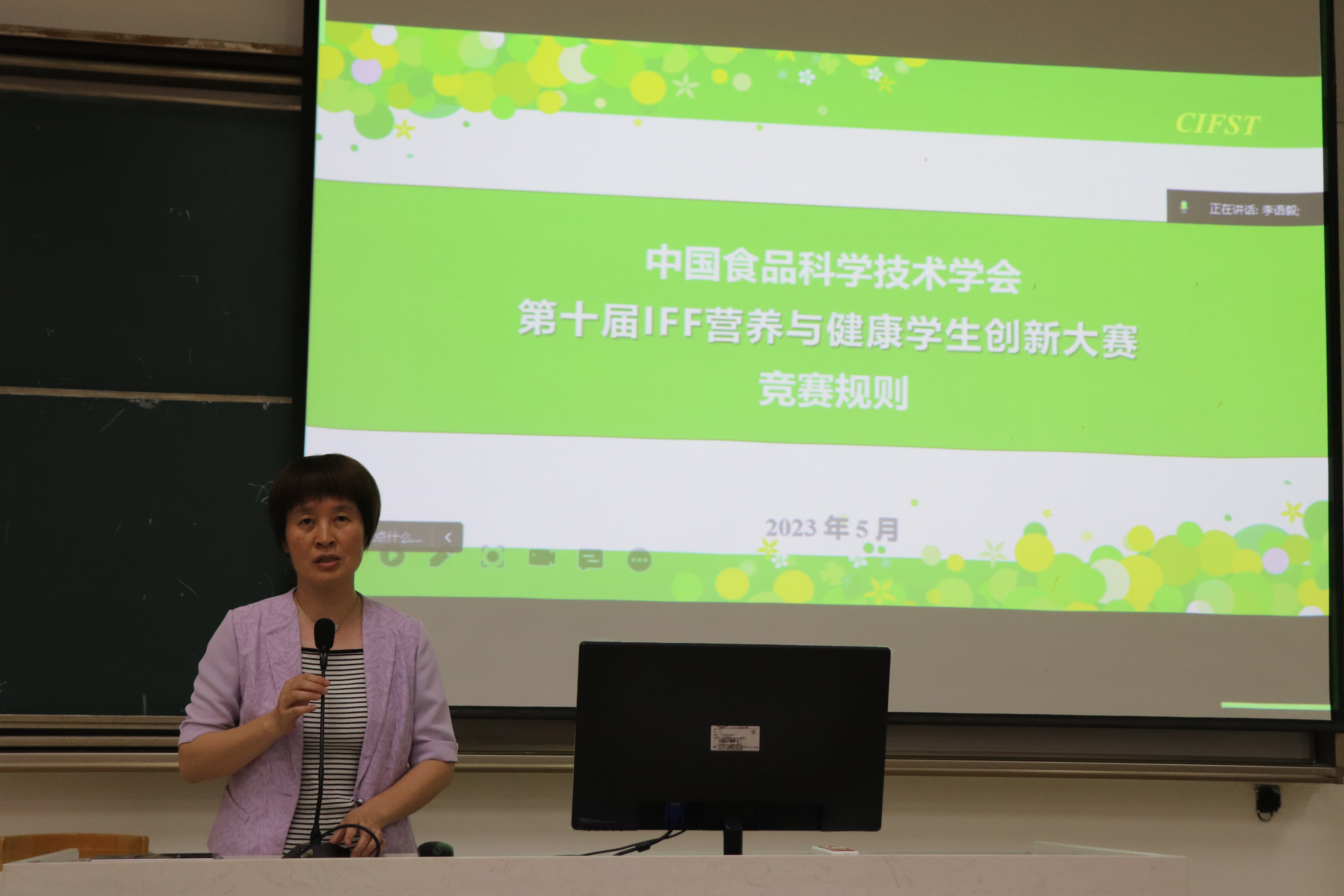 随后,我院倪莉教授讲述了IFF比赛的渊源、本次比赛的主题以及相关的要求,指出本次大赛的目的是想要推进高校和企业产学研合作,促进食品行业的发展;建议大家关注食品行业的发展趋势,抓住热点,鼓励大家通过比赛积极思考、激发兴趣,设计自己的目标。