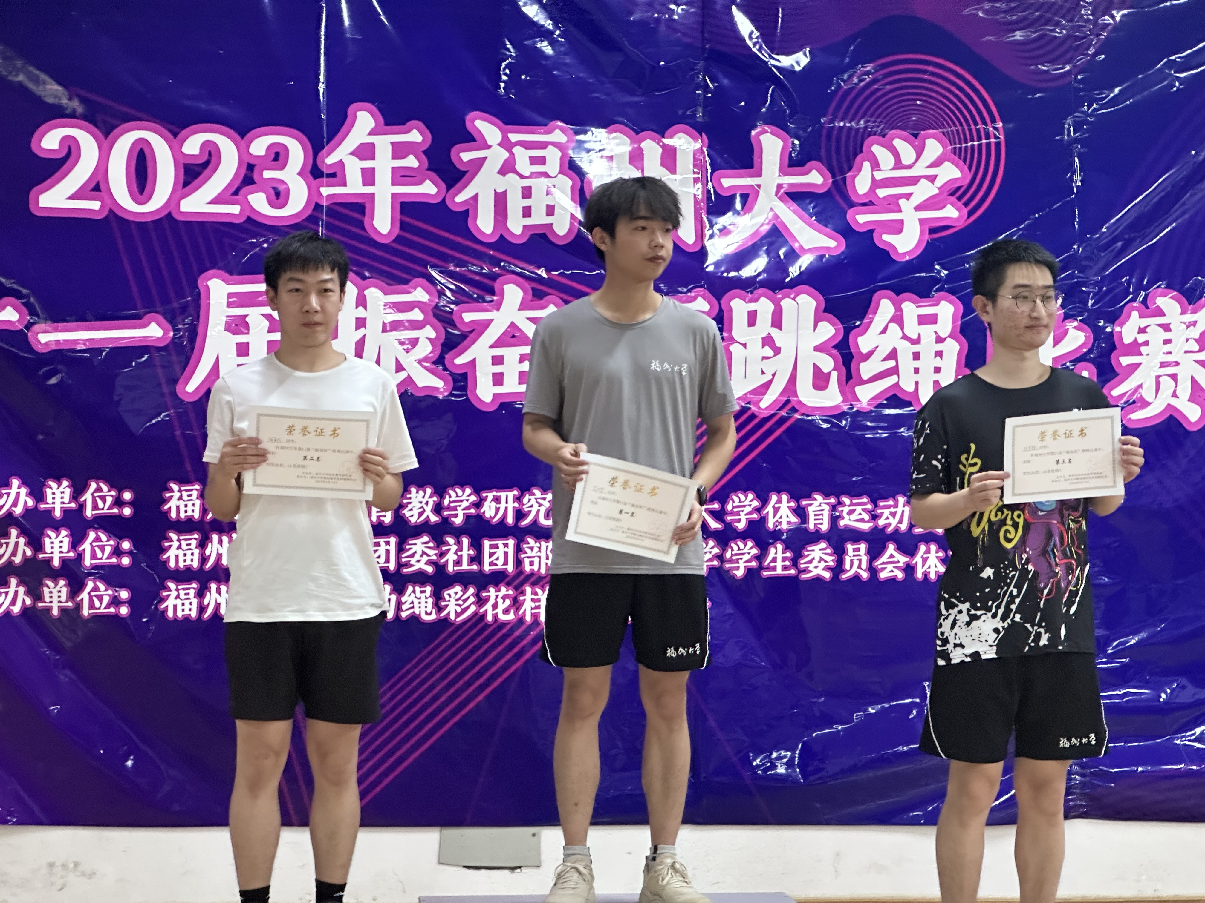 为全面贯彻党的教育方针,鼓励学生积极参与锻炼,提高身体素质和意志品质,我校于5月14日举办福州大学第十一届“振奋杯”跳绳比赛。我院斩获男子组30s单摇第一名、团体组1分钟交互竞速第一名、男子组30s双摇第二名、男子组30s间隔交叉跳第二名、1分钟并脚跳第五名、以及30s一带一跳第六名的优异成绩,展现了学院同学朝气蓬勃、积极向上的精神面貌和团结协作、奋勇争先的良好风采。