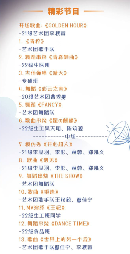本次活动以表演者提前录制表演视频并投送至主办方,主办者通过线上直播平台播放的形式开展。活动中,我院研究生、本科生学子积极参与。其中,2022级食品班同学表演《dance time》利用别出心裁的创意形式和激情洋溢的歌舞表演为观众们带去了快乐与欢笑。2020级艺术团舞蹈队曹秀雯同学的一支《彩云之南》,翩翩而立,轻柔舒缓,如一只孔雀上下飞舞,顾盼生姿,使观众们大呼惊艳。我院专硕班吉他弹唱一曲《晴天》,清澈的歌声与细腻的吉他声相得益彰,为观众们送去一抹温暖而安宁的阳光。随后,有艺术团舞蹈队献上的一支《fancy》,热情似火的舞蹈瞬间炸燃全场,观众们纷纷用弹幕参与这场狂欢。