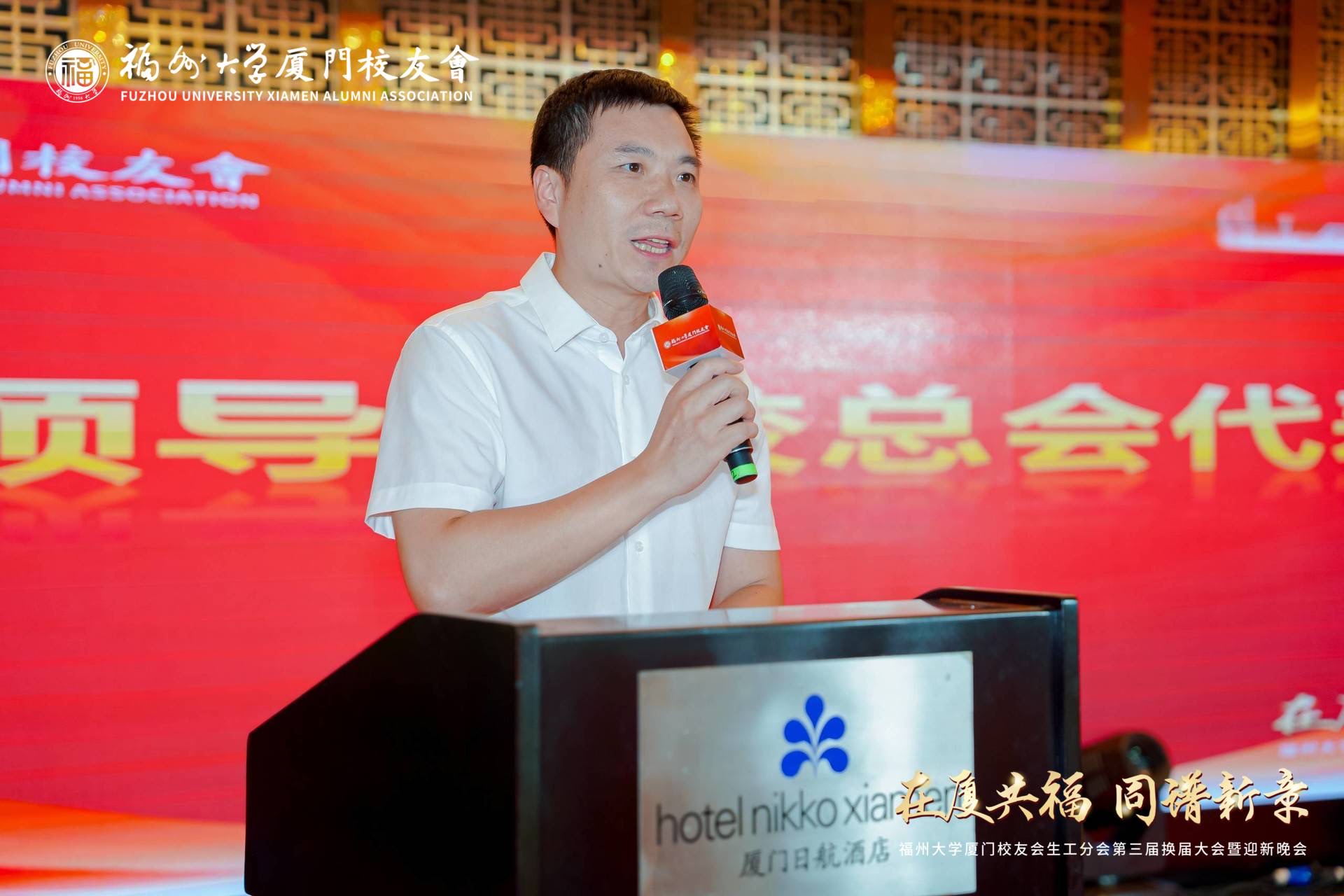 福州大学校友会工作办公室副主任兰荣嵩代表学校校友总会向厦门校友会生工分会理事会换届大会召开表示热烈祝贺,向为为本次换届工作付出辛勤努力的校友们表示由衷感谢,他向与会校友介绍了学校近年来的发展成绩,充分肯定了厦门校友会生工分会理事会自成立以来所作的贡献,并希望第三届理事会继续深化服务理念,时刻关注校友需求,不断夯实组织基础,充分发挥校友之间的凝聚能力,将厦门校友会生工分会建设得更好、更强、更温暖,同时也欢迎校友们常回家看看,共庆福州大学六十五载华诞。