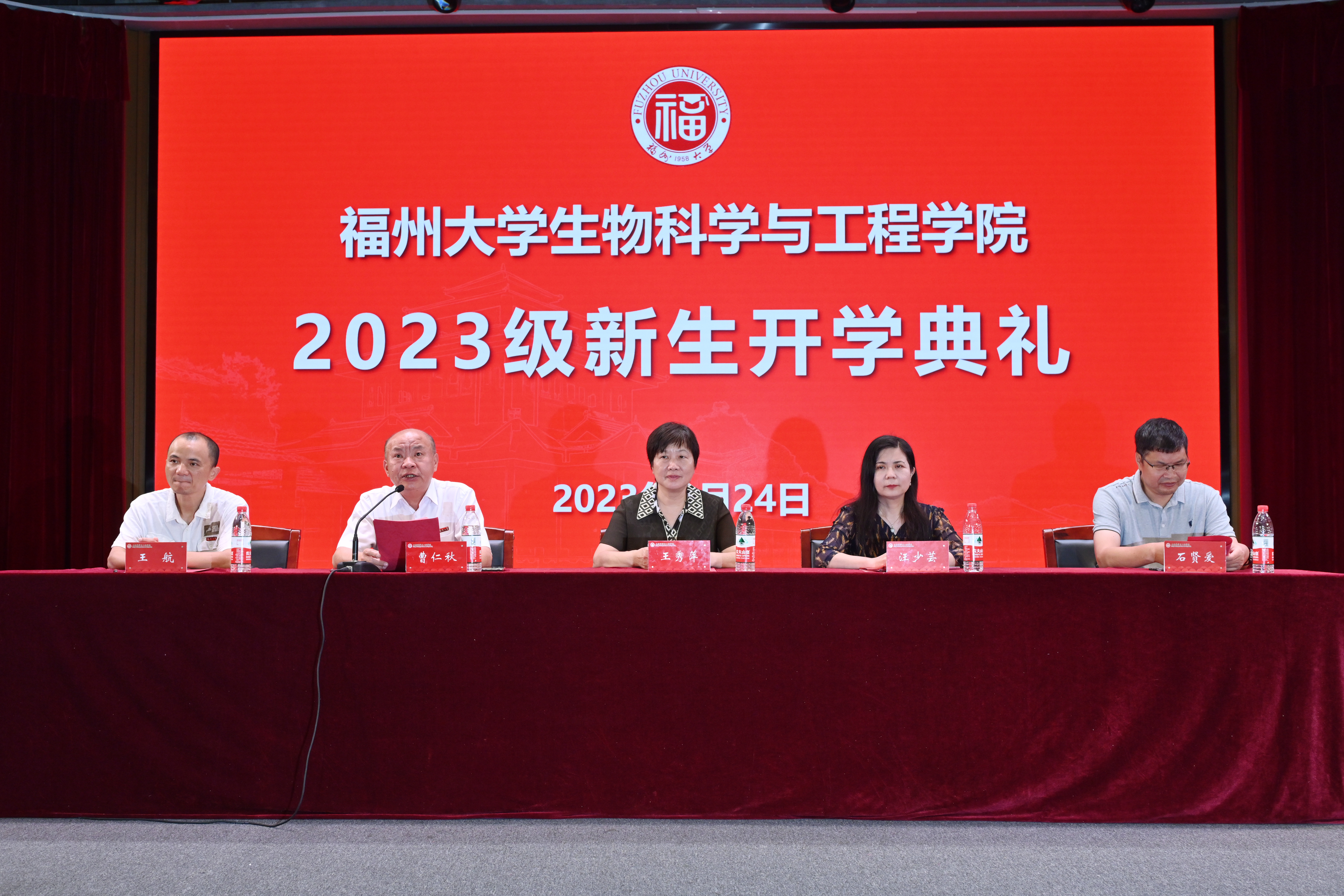 9月24日上午9:00,福州大学生物科学与工程学院2023级新生开学典礼在旗山校区博学厅举行。院党委王秀萍书记、院长汪少芸教授、院党委曹仁秋副书记、副院长石贤爱教授、副院长王航副教授出席典礼,学院中层干部、全体思政辅导员及学院2023级全体新生共计四百余人参加典礼。开学典礼由院党委曹仁秋副书记主持。
