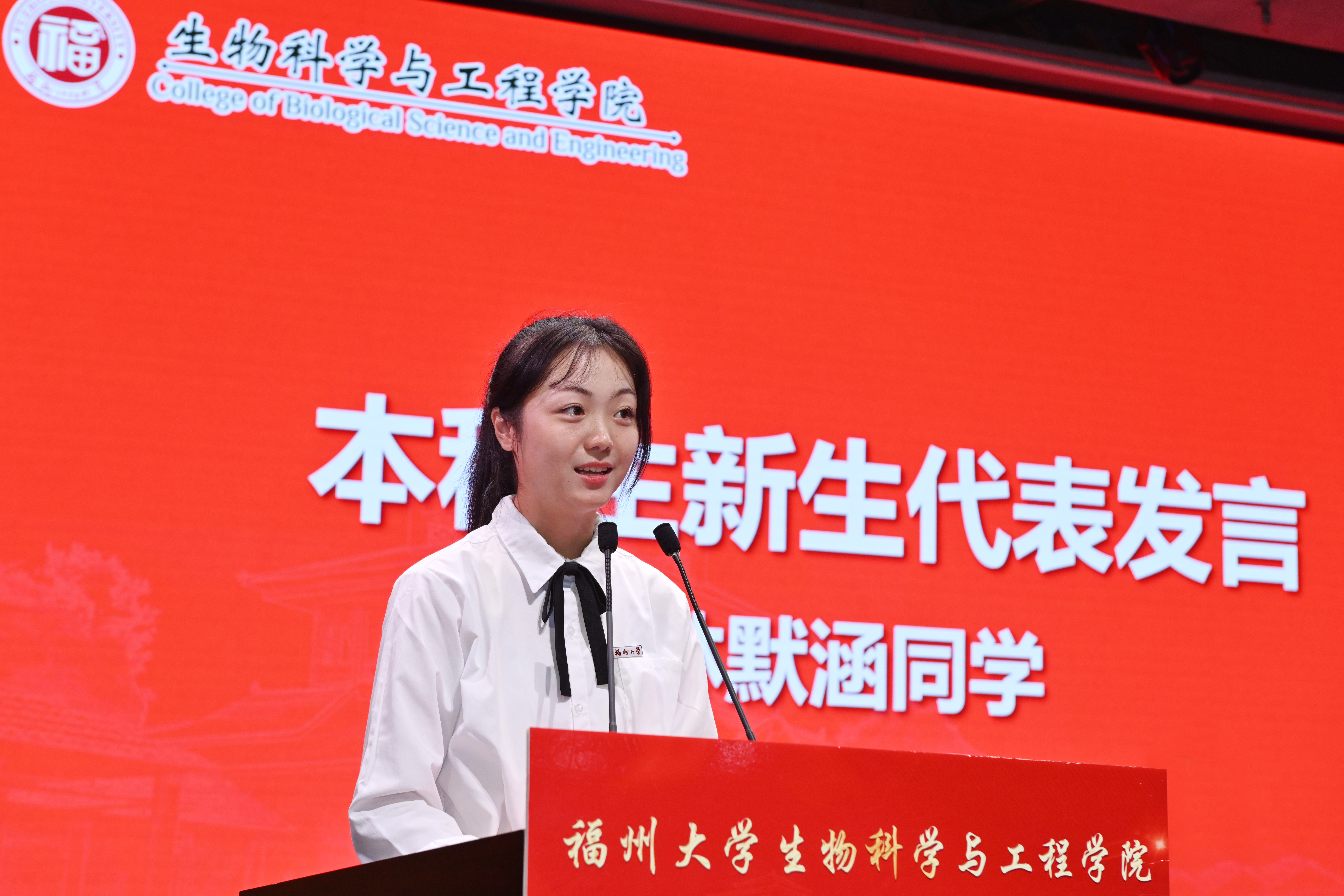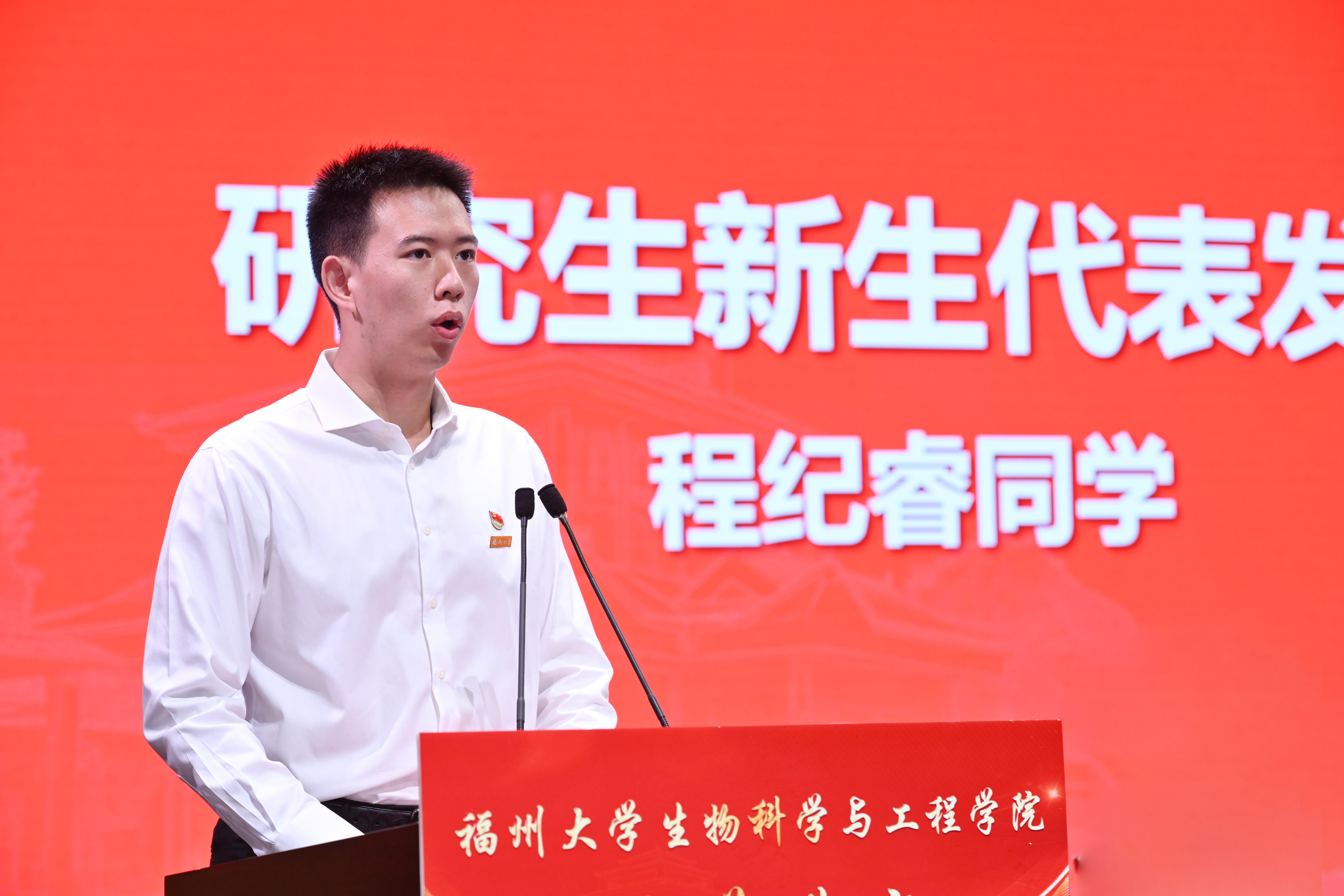 2023级本科生新生代表林默涵同学分享了自己在高中阶段艰难刻苦的学习经历和心路历程。作为大一新生,当学做人,学立世,做有担当的福大人,做到“心中有国家,肩头有担当,脚下有行动”。2023级研究生新生代表程纪睿分享了自己为实现更大的梦想,选择进入生工学院继续深造求学的心路历程, “怀着耐心、信心和决心,以科研创新为己任,以胸中理想为灯塔”,努力进步,为将福大建设成为世界一流的东南强校而不懈奋斗。老生代表2020级陈怡帆同学深情回顾了自己大学三年在学业、学科竞赛、团学工作中不断突破舒适区、攀登新高峰的历程,鼓励新生同学把学习作为根基,保持积极乐观的心态,勇于接受各种尝试和挑战,努力做埋头苦学、精神激扬的奋斗者和起而行之、奋楫争先的行动者,奋力书写大学精彩的画卷和无愧于时代的华彩篇章。