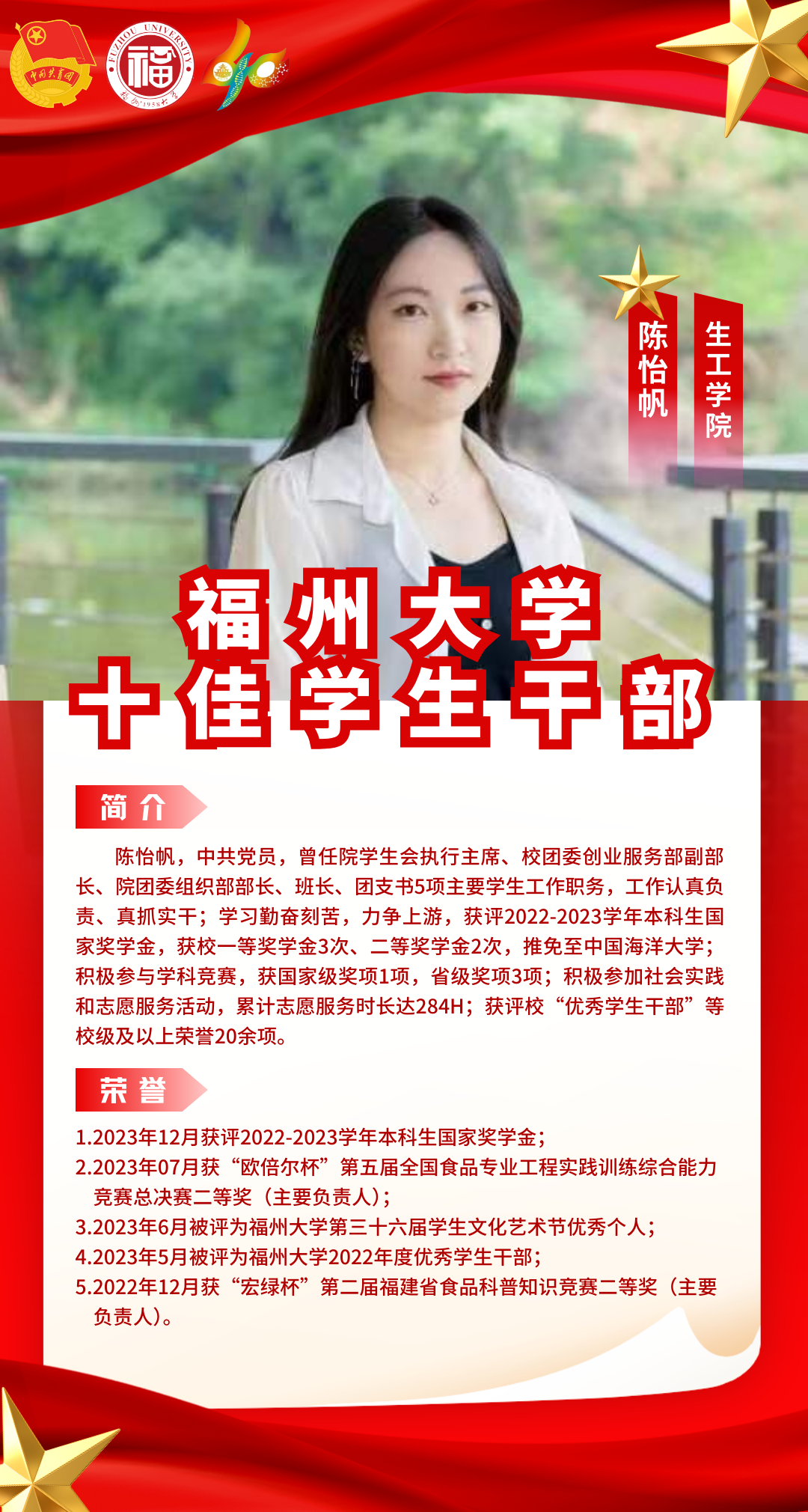 陈怡帆,中共党员,曾任院学生会执行主席、校团委创业服务部副部长、院团委组织部部长、班长、团支书5项主要学生工作职务,工作认真负责、真抓实干;学习勤奋刻苦,力争上游,获评2022-2023学年本科生国家奖学金,获校一等奖学金3次、二等奖学金2次,推免至中国海洋大学;积极参与学科竞赛,获国家级奖项1项,省级奖项3项;积极参加社会实践和志愿服务活动,累计志愿服务时长达284h;获评校“优秀学生干部”等校级及以上荣誉20余项。