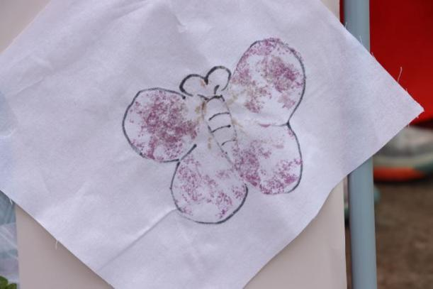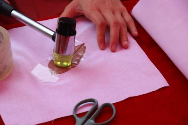 在活动现场,大家在校园里采集、挑选自己喜欢的花瓣和叶片,小心翼翼地用胶带将其固定在方巾上,然后用橡胶锤轻轻敲打,每一次敲击都仿佛是在与大自然对话,让我们感受到了生命的韵律和力量,再将胶带取下,留下一幅幅栩栩如生的植物拓印作品。
