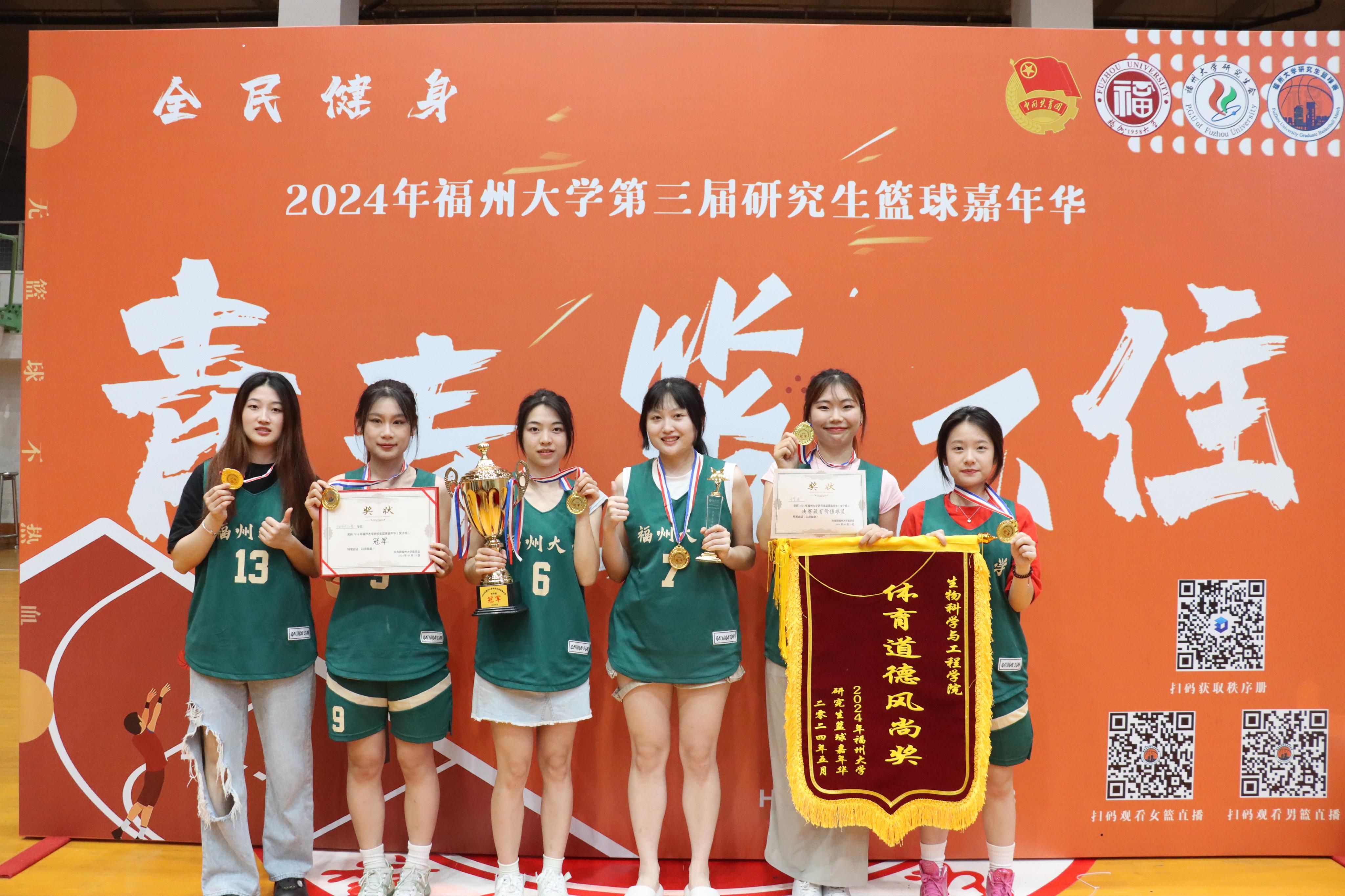 5月25日下午,2024年福州大学第三届研究生篮球嘉年华女子三人赛在旗山校区风雨操场内的篮球馆圆满结束。在这场充满激情与活力的赛事中,由我院研究生马笑语、范子欣、刘远玲、杨静、雷蕾、詹子佳等六名队员组成的生工战队在赛场上一路过关斩将、奋力拼搏,最终以出色的表现斩获冠军并荣获体育道德风尚奖。