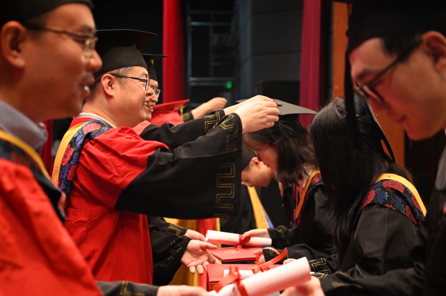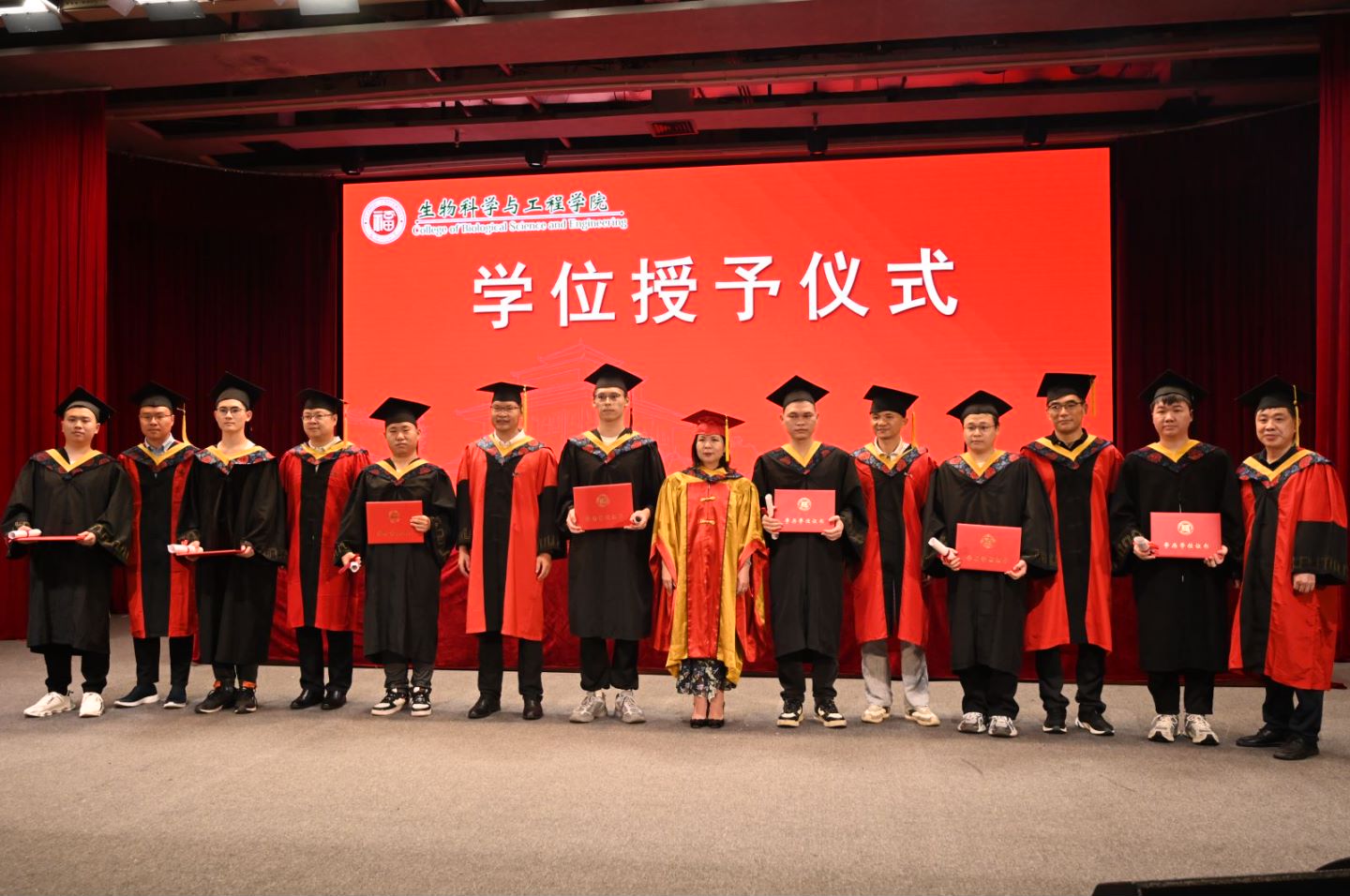 在学位授予仪式中,院长汪少芸教授、副院长石贤爱教授、副院长王航副教授,院学术委员会成员孟春教授、刘树滔教授、翁祖铨教授、徐芃教授共同为生工学院2024届毕业生拨穗正冠、授予学位证书,并与毕业生合影留念。