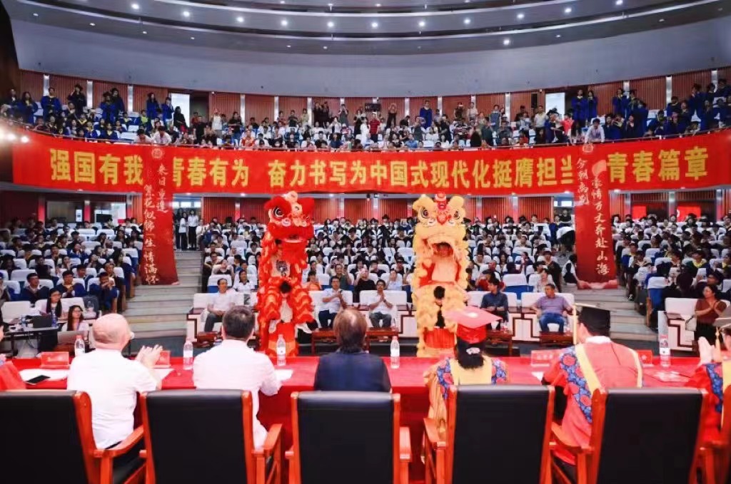 博学厅里,师生和家长盛装出席,喜悦之情溢于言表。毕业生代表带来的歌曲串烧掀起的第一个高潮。语音绕梁的合唱后,两头雄狮伴随豪迈音乐隆重登场,勇猛跳跃、灵动旋转,寓意雄狮腾跃向未来。随后,“今朝离别,豪情万丈奔赴山海;来日重逢,繁花似锦‘生’情满怀”大型竖幅从博学厅二层铺展而开,现场气氛被浓情点燃。