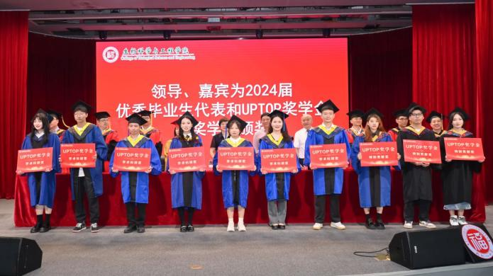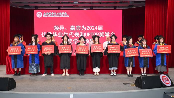 随着庄严的国歌声回荡,毕业典礼缓缓启幕。石贤爱副院长宣读了2024届毕业生学位授予名单,福州大学2024届优秀毕业生、2024届UPTOP特别贡献奖学金、2024届UPTOP学术科研奖学金的表彰决定。学院领导和参会嘉宾依次为获奖学生代表颁奖。